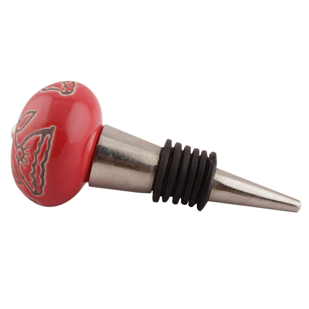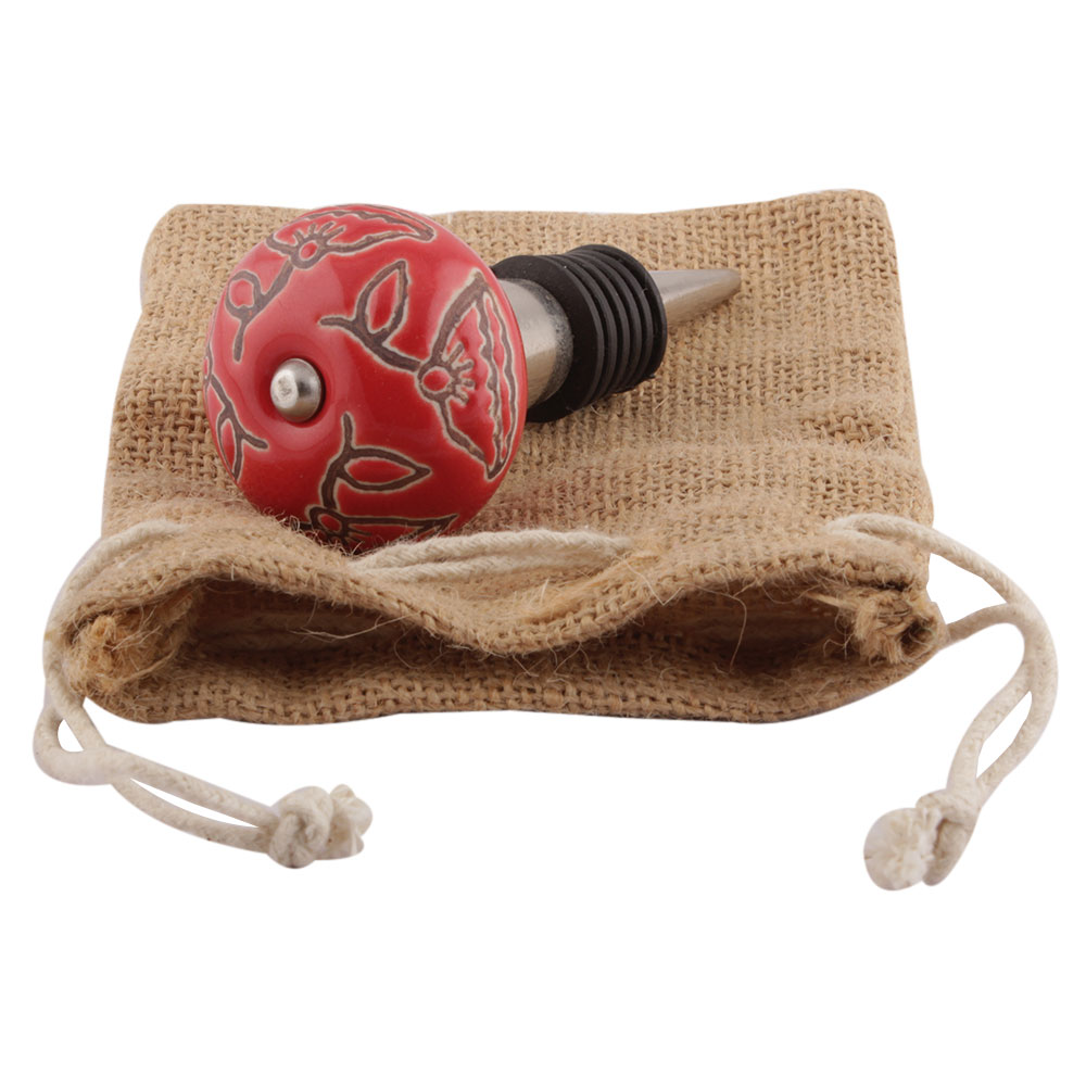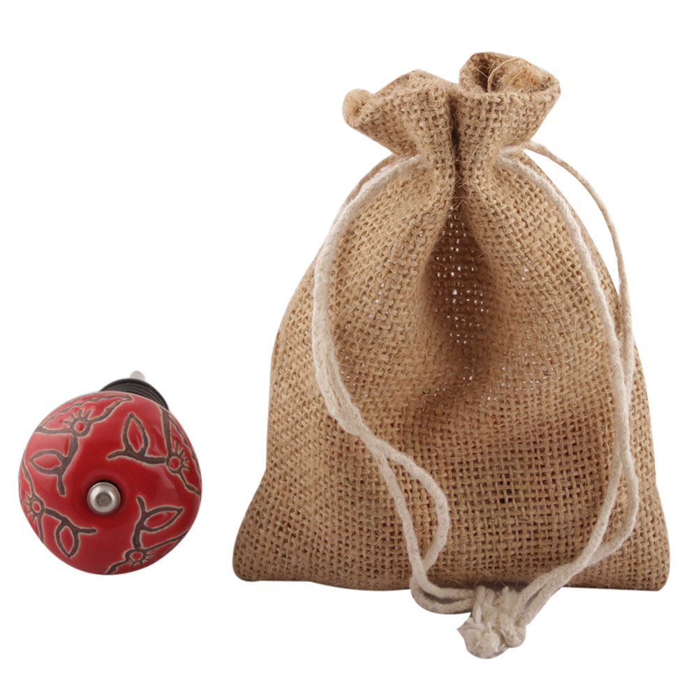 Red Calla Lily Brown Etched Ceramic Wine Stopper. Zinc Alloy Wine Bottle Stopper with Attractive Jute Bag Packaging.