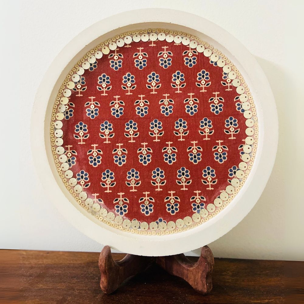 Bring vibrance and elegance to your space with this Red Cemented Plate for Home Decor, featuring a striking floral block-printed design. Handcrafted with care, the bold red base paired with delicate blue and white motifs makes it a stunning accent for walls, tables, or gifting. A perfect blend of rustic craftsmanship and timeless charm, this plate enhances any living space.