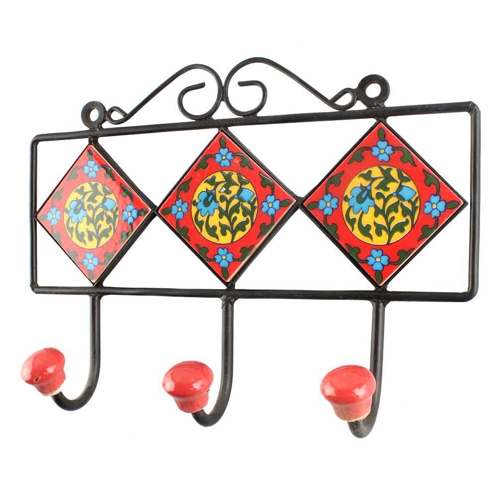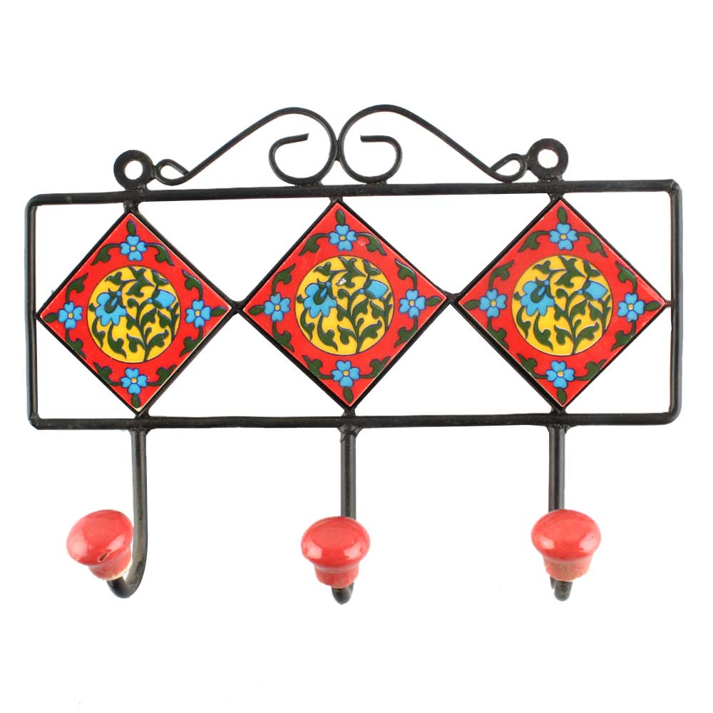Red Ceramic Floral Tile Hook. When Put on Wall or Cabinet It is An Art in Itself. The Metal Part of this Hook is Black Powder Coated.