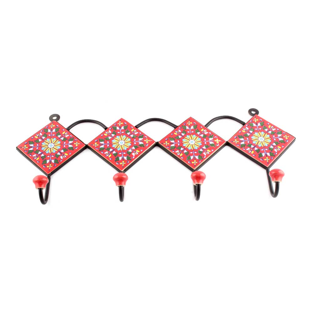 Red Ceramic Floral Tiles Hooks Online. When Put on Wall or Cabinet It is An Art in Itself. The Metal Part of this Hook is Black Powder Coated.
