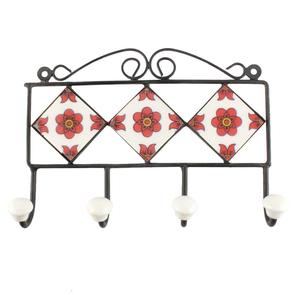 Red Ceramic Tiny Flower Tile Hook. When Put on Wall or Cabinet It is An Art in Itself. The Metal Part of this Hook is Black Powder Coated.