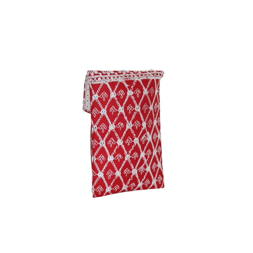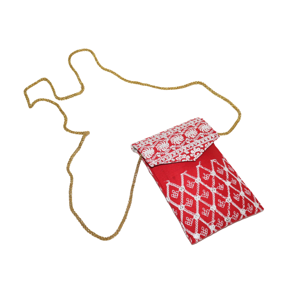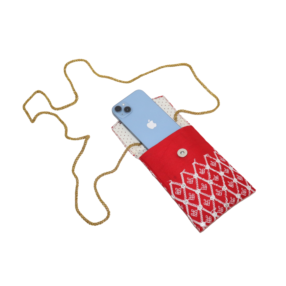 Add a pop of color and elegance with this beautiful handmade cotton clutch, adorned with intricate mirror work and a vibrant red design. The gold chain strap adds a luxurious touch, allowing for hands-free carrying at weddings, parties, or casual outings. The stunning mirror work, combined with delicate white embroidery, creates a sparkling contrast against the red cotton fabric, making this clutch both stylish and unique. Perfect for any special occasion, it offers ample space for essentials like your phone, makeup, and cards. The intricate pattern and craftsmanship reflect timeless artistry, making it an ideal accessory for those seeking a chic yet functional piece. Handcrafted with care, this clutch combines traditional mirror work with modern style, giving it a distinct and timeless appeal. Elevate your fashion game and make a statement with this exquisite, handcrafted accessory.