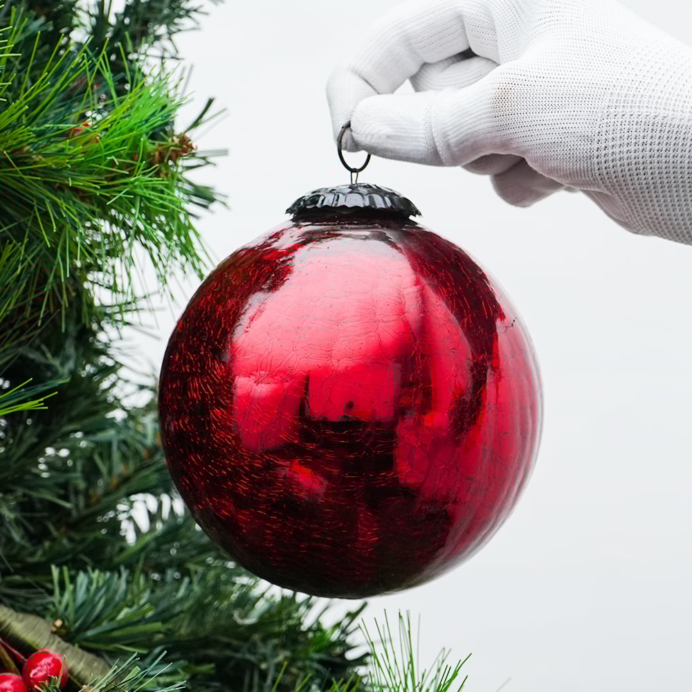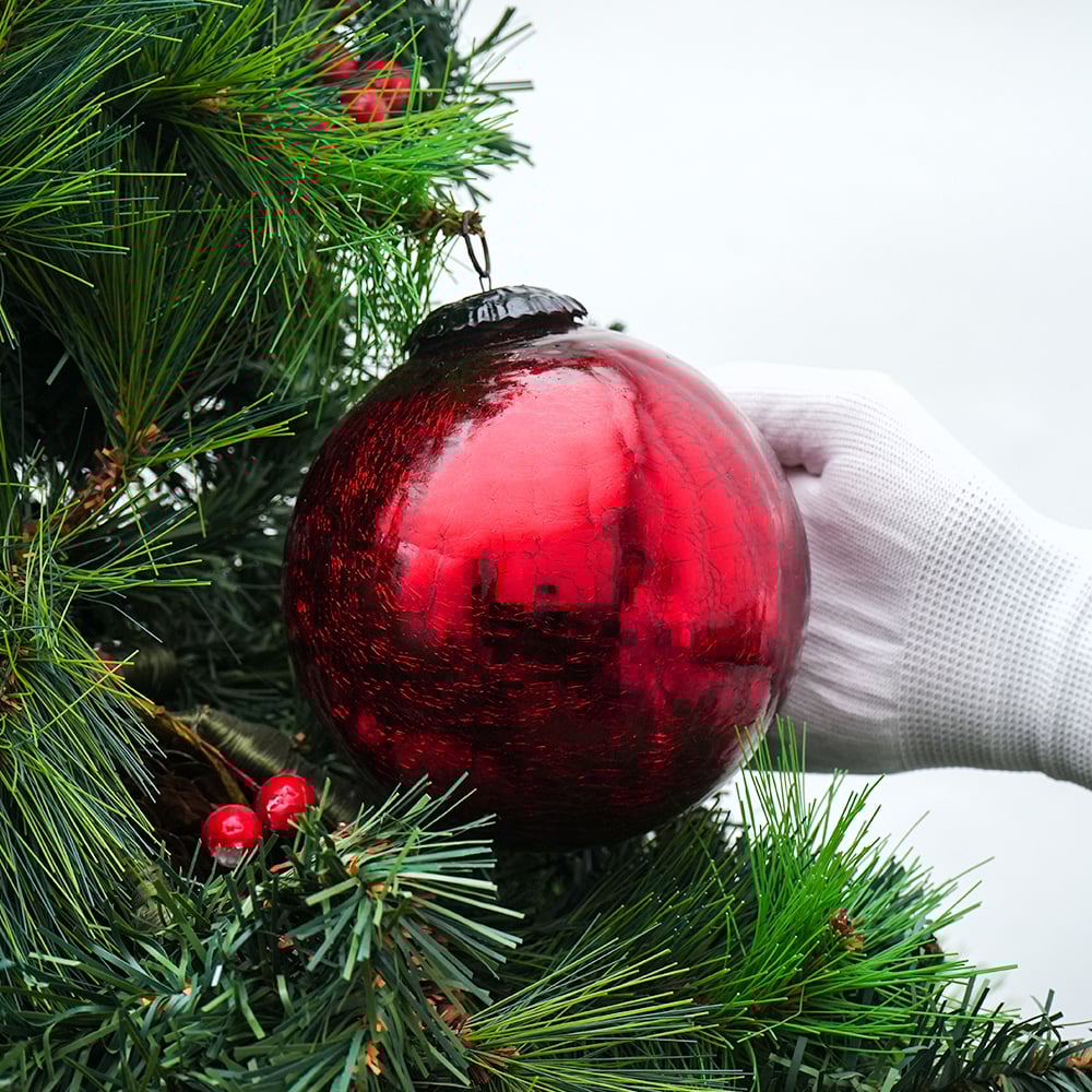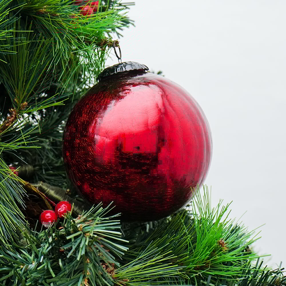 Red Crackle Round Christmas Ball Ornament. Crafted from high-quality glass with a smooth glossy finish, this decorative bauble adds a classic and festive touch to Christmas trees, wreaths, and holiday displays.