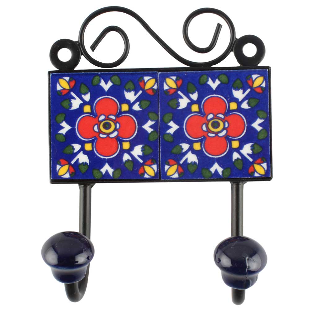 Red Floral Ceramic Tile Hook. When Put on Wall or Cabinet It is An Art in Itself. The Metal Part of this Hook is Black Powder Coated.