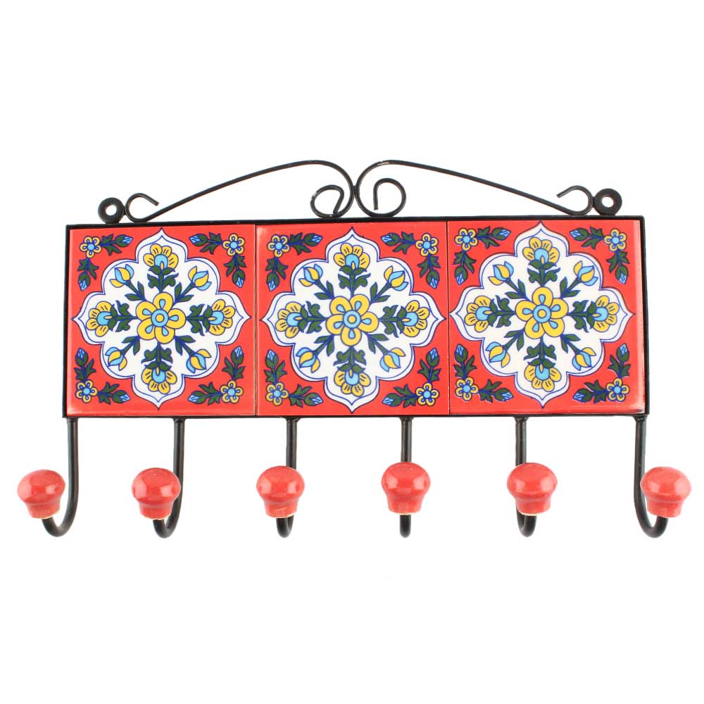 Red Floral Ceramic Tile Hook Online. When Put on Wall or Cabinet It is An Art in Itself. The Metal Part of this Hook is Black Powder Coated.