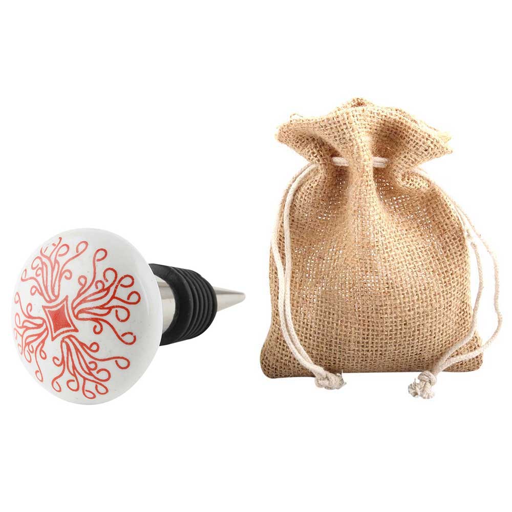Red Leaf Flat Ceramic Wine Bottle Stopper. Zinc Alloy Wine Bottle Stopper with Attractive Jute Bag Packaging.