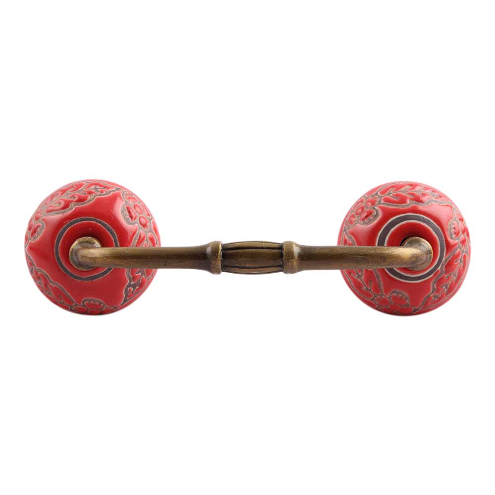 Red Leaf Flower Etched Ceramic Bridge Handle. Ideal for Drawer, Dresser, Cabinet, Wardrobe, Cupboard and Almirah.