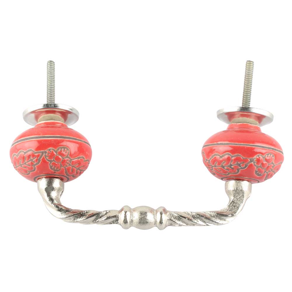 Red Leaf Flower Etched Ceramic Cut Bridge Handle. Ideal for Drawer, Dresser, Cabinet, Wardrobe, Cupboard and Almirah etc.