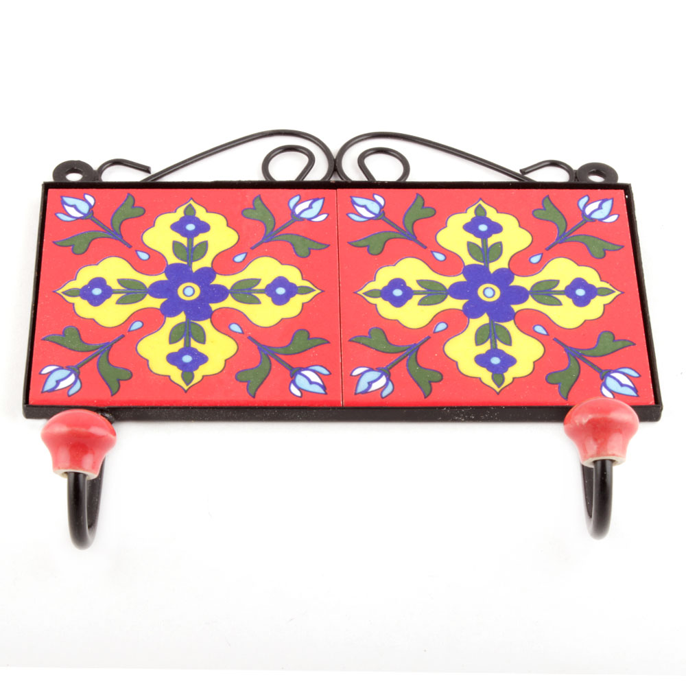 Red Navy Blue Flower Tiles Hooks. When Put on Wall or Cabinet it is an Art in itself. The Metal Part of this Hook is Black Powder Coated.