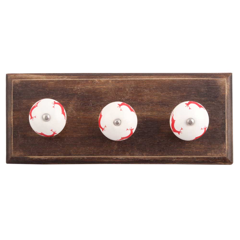 Red Running Rein Deer Pattern Ceramic Wooden Hook. A Perfect Complement to the Soft Tone of the Wood are these White Traditional Hat & Coat Hook Made of Genuine Porcelain and Brass. It can be use to Hang Jewellery, Leashes, Towels, Scarves, Light Weight Sweaters, Caps Etc.