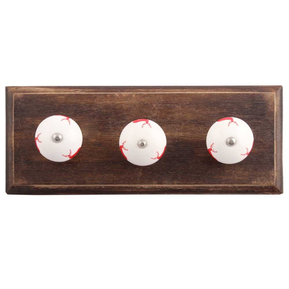 Red Standing Rein Deer Pattern Ceramic Wooden Hook. A Perfect Complement to the Soft Tone of the Wood are these White Traditional Hat & Coat Hook Made of Genuine Porcelain and Brass. It can be use to Hang Jewellery, Leashes, Towels, Scarves, Light Weight Sweaters, Caps Etc.