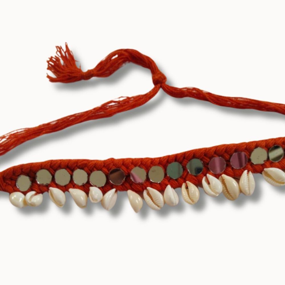 The Red Threads and Mirror Shell Choker Necklace is a bold expression of Indian folk-inspired adornment, where texture and reflection come together in harmony. Crafted on a fabric base, layers of red threads create depth and movement, while silver-toned mirror shell accents introduce light-catching brilliance. Adjustable in fit, this choker sits comfortably at the neckline, making it both striking and wearable. Designed for festive moments, it carries the energy of celebration and handcrafted artistry.