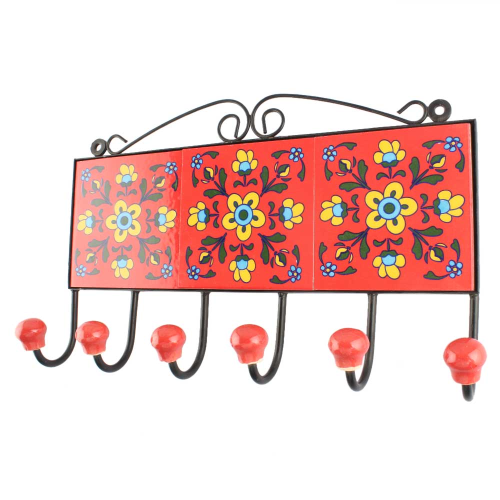 Red Tiny Flower Ceramic Tile Hook Online. When Put on Wall or Cabinet It is An Art in Itself. The Metal Part of this Hook is Black Powder Coated.