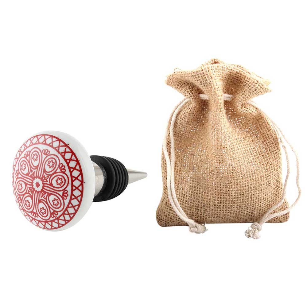 Red Wheel Flat Ceramic Wine Bottle Stopper. Zinc Alloy Wine Bottle Stopper with Attractive Jute Bag Packaging.