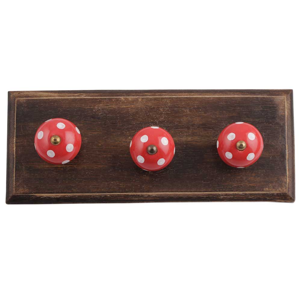 Red White Dot Wooden Hooks. A Perfect Complement to the Soft Tone of the Wood are these White Traditional Hat Coat Hook Made of Genuine Porcelain and Brass. It can be use to Hang Jewellery, Leashes, Towels, Scarves, Light Weight Sweaters, Caps Etc.