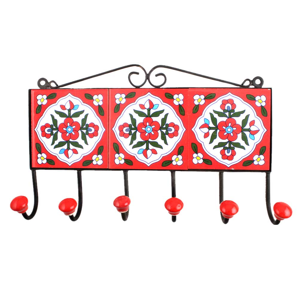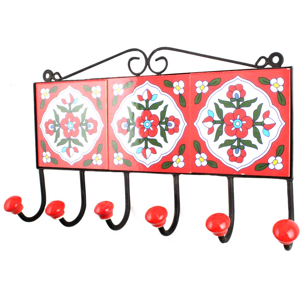 Red White Floral Tiles Hook. When Put on Wall or Cabinet It is An Art in Itself. the Metal Part of This Hook is Black Powder Coated.