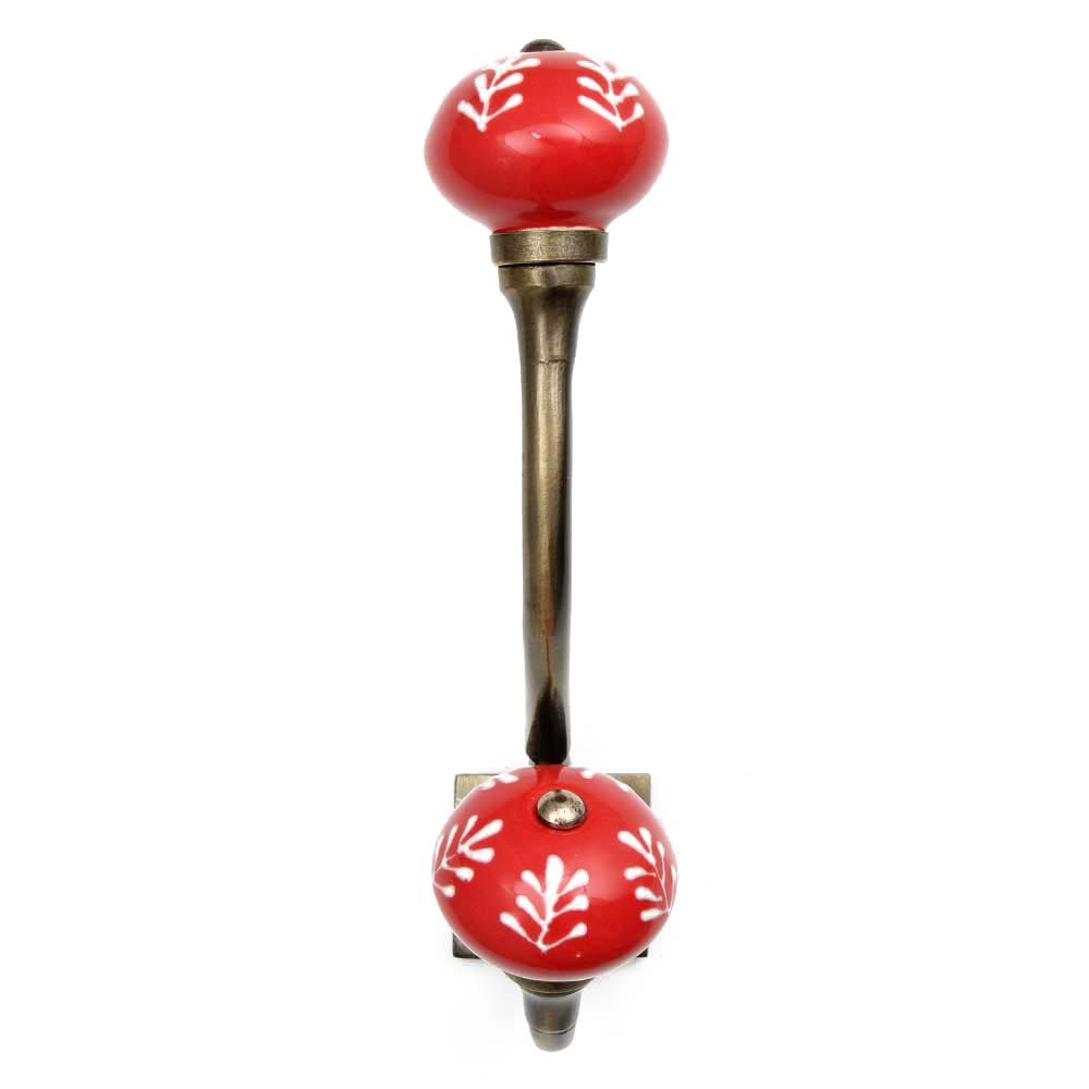 Material: Wrought iron base with hand-painted, kiln-fired ceramic knob Finish: Antique iron with glossy red and white leaf ceramic detailing Installation: Wall-mounted with concealed hardware; includes screws and anchors