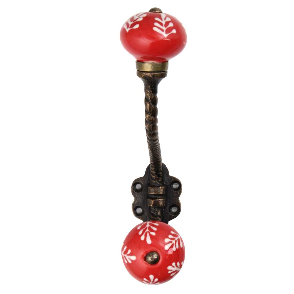 Material: Glazed ceramic knob with hand-painted red and white leaf design, cast iron rope-style hook