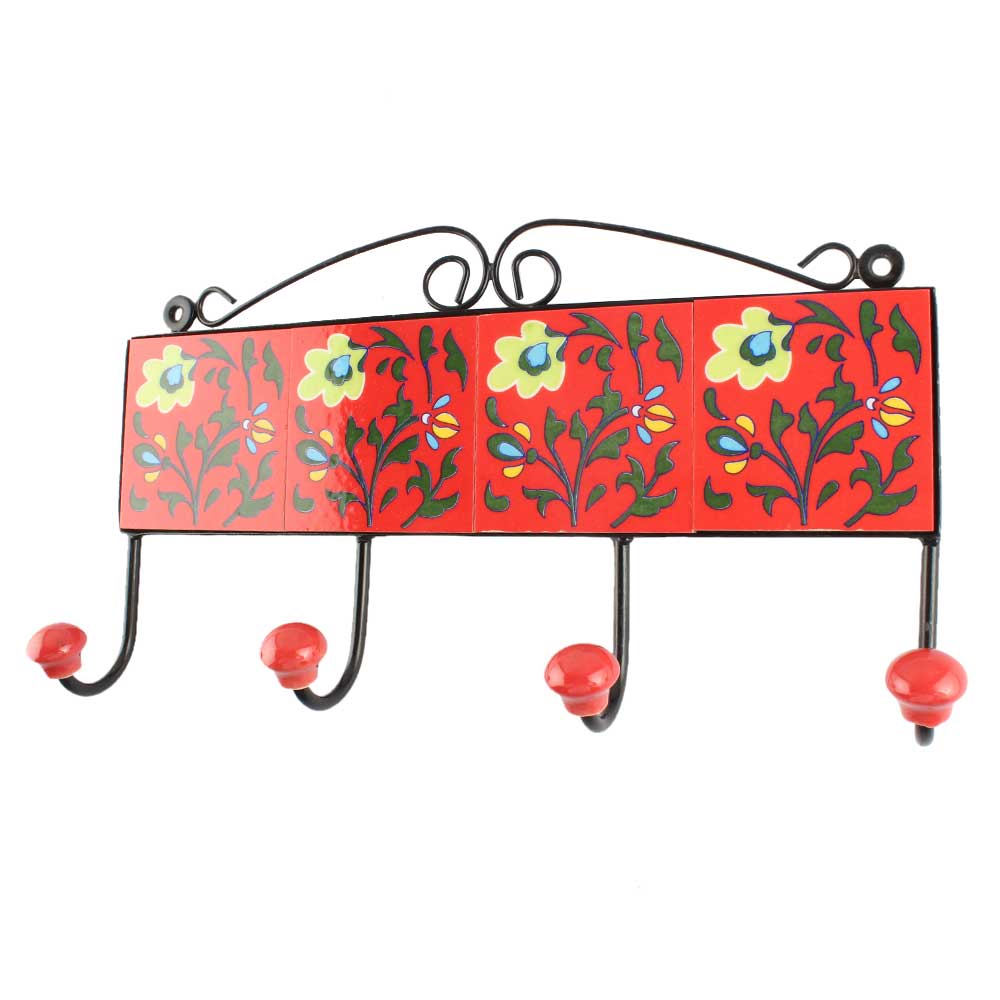 Red With Forest Green Leaf Flower Ceramic Tile Hook. When Put on Wall or Cabinet It is An Art in Itself. The Metal Part of this Hook is Black Powder Coated.
