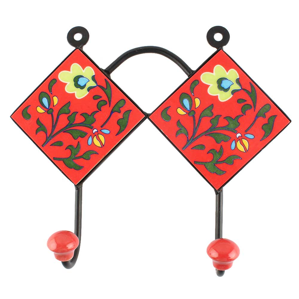 Red With Forest Green Leaf Flower Ceramic Tile Hook. When Put on Wall or Cabinet It is An Art in Itself. The Metal Part of this Hook is Black Powder Coated.