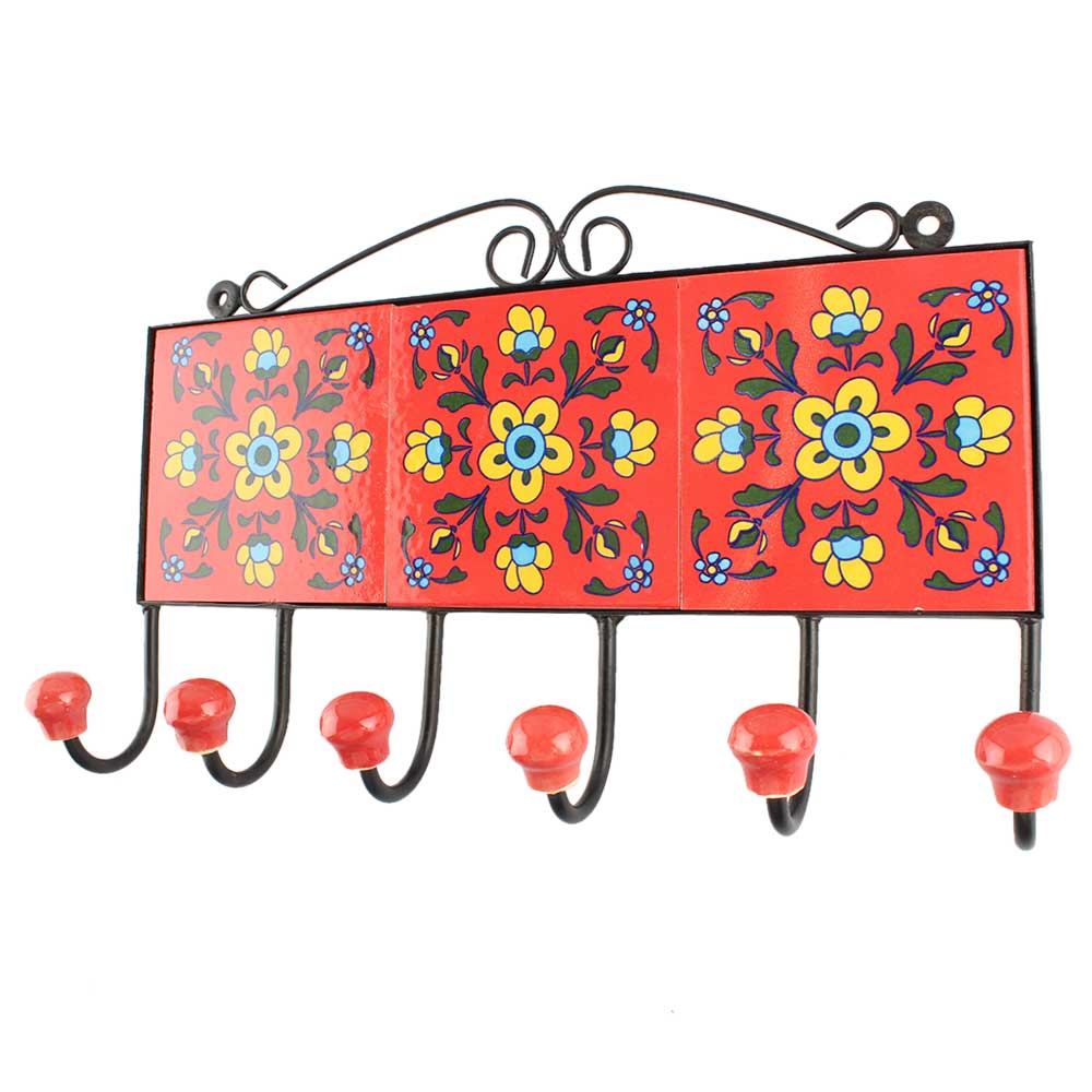 Red With Yellow Tiny Flower Ceramic Tile Hook. When Put on Wall or Cabinet It is An Art in Itself. The Metal Part of this Hook is Black Powder Coated.