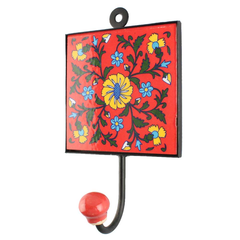 Red With Yellow Wheel Flower Ceramic Tile Hook. When Put on Wall or Cabinet It is An Art in Itself. The Metal Part of this Hook is Black Powder Coated.