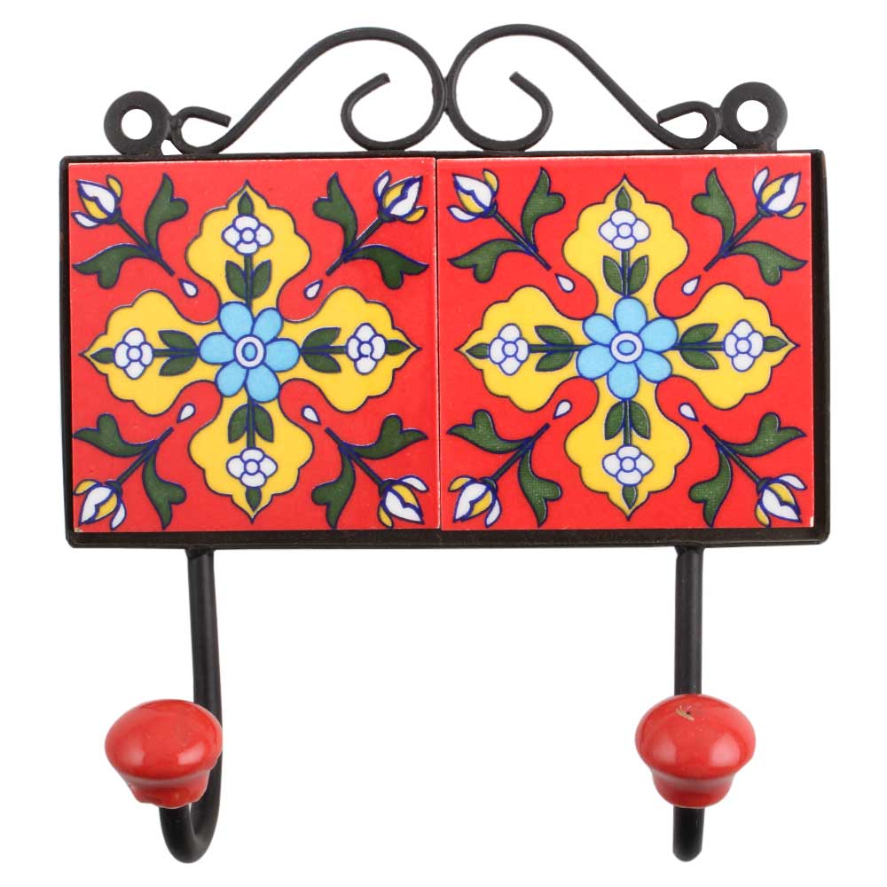 Red Yellow Floral Tiles Hook. When put on wall or cabinet it is an art in itself. The metal part of this hook is black powder coated.
