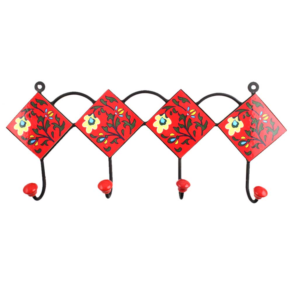 Red Yellow Floral Tiles Hook. When Put on Wall or Cabinet It is An Art in Itself. the Metal Part of This Hook is Black Powder Coated.