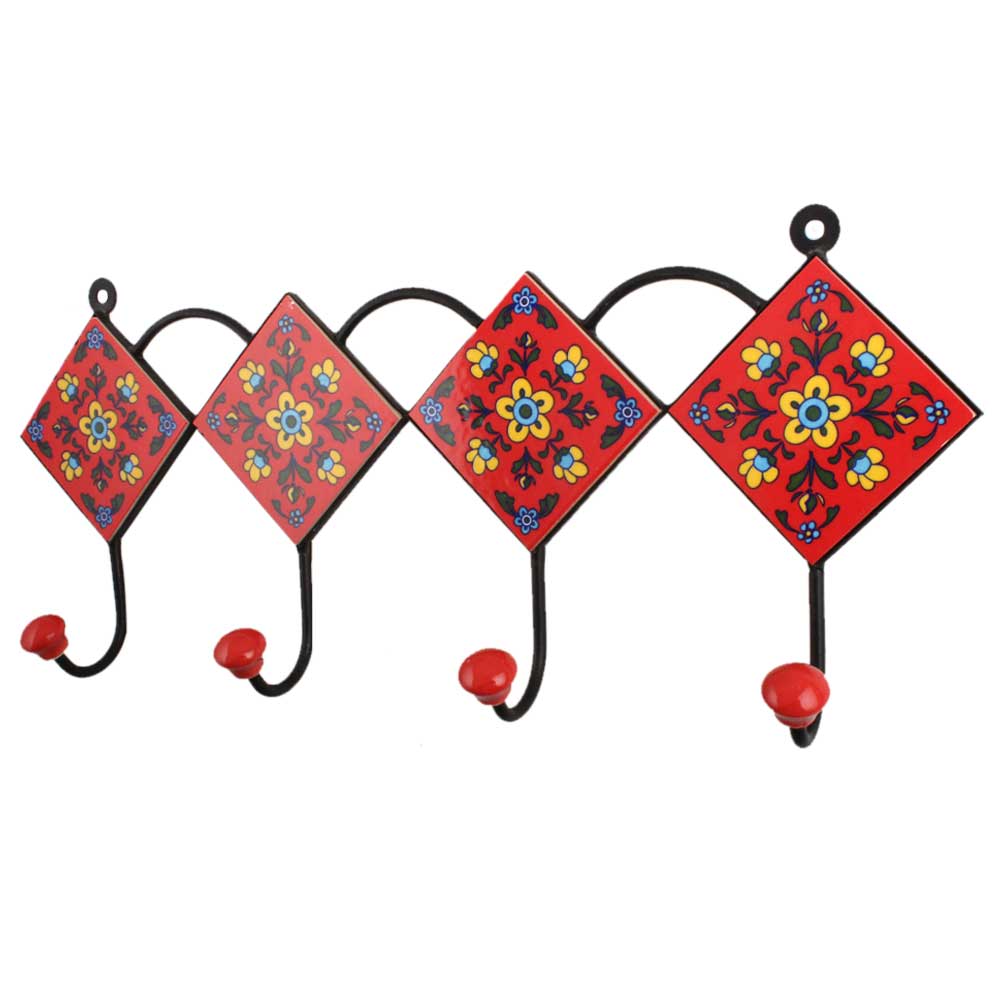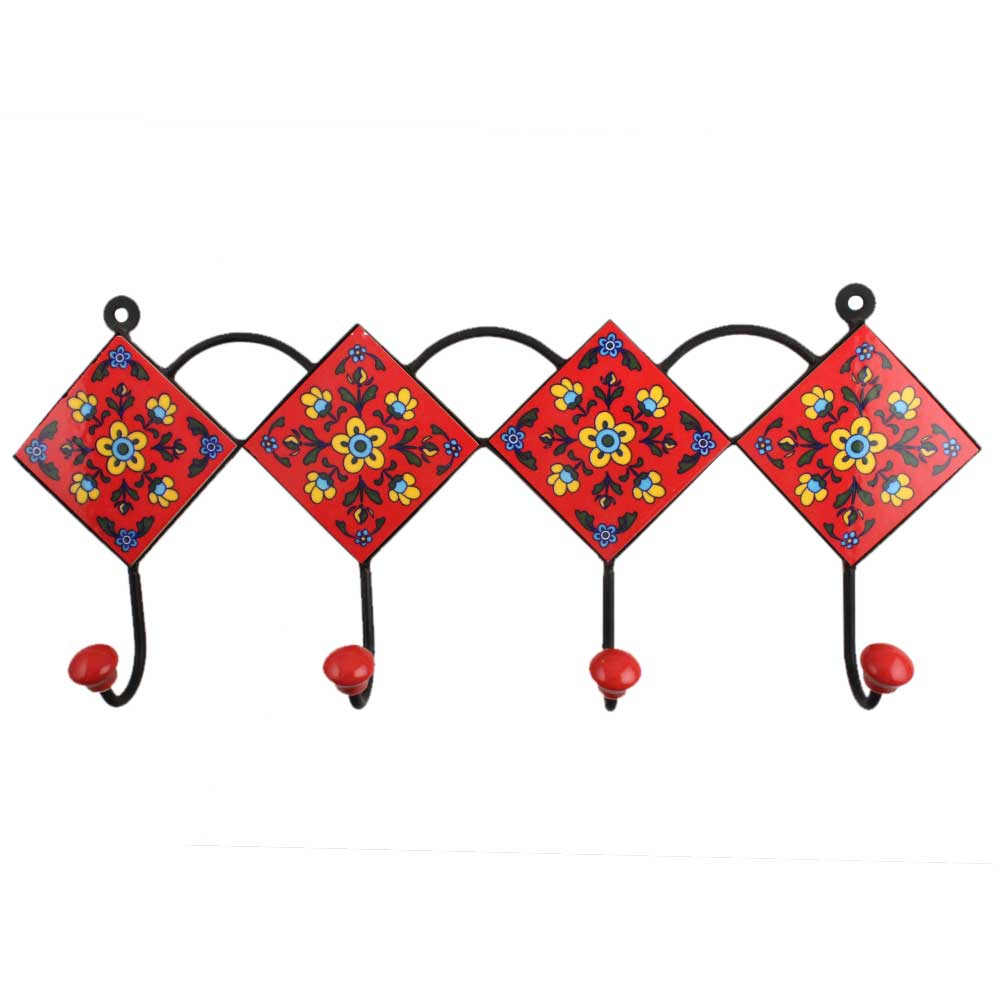 Red Yellow Floral Tiles Hook. When Put on Wall or Cabinet It is An Art in Itself. the Metal Part of This Hook is Black Powder Coated.