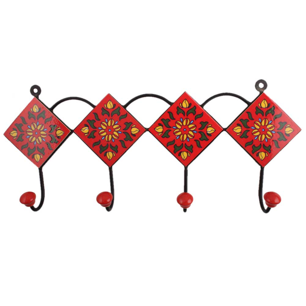 Red Yellow Floral Tiles Hook. When Put on Wall or Cabinet It is An Art in Itself. the Metal Part of This Hook is Black Powder Coated.