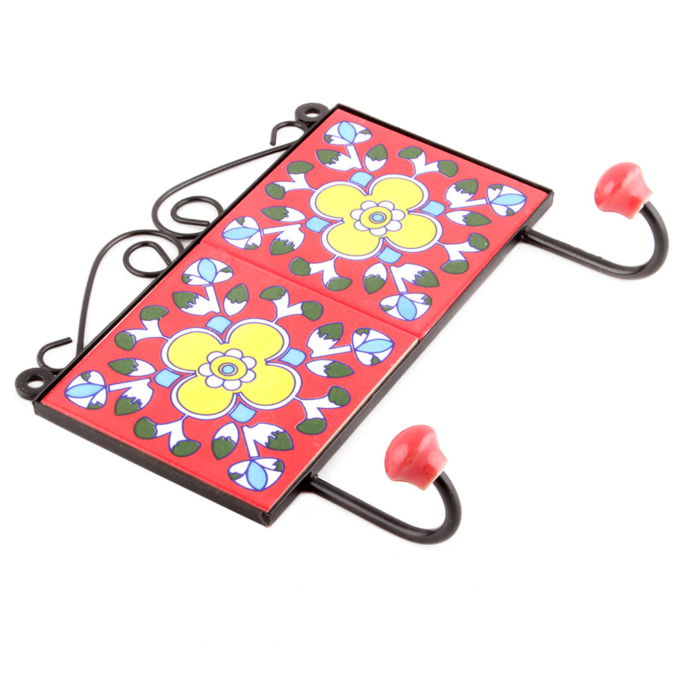 Red Yellow Floral Tiles Hooks. When Put on Wall or Cabinet it is an Art in itself. The Metal Part of this Hook is Black Powder Coated.