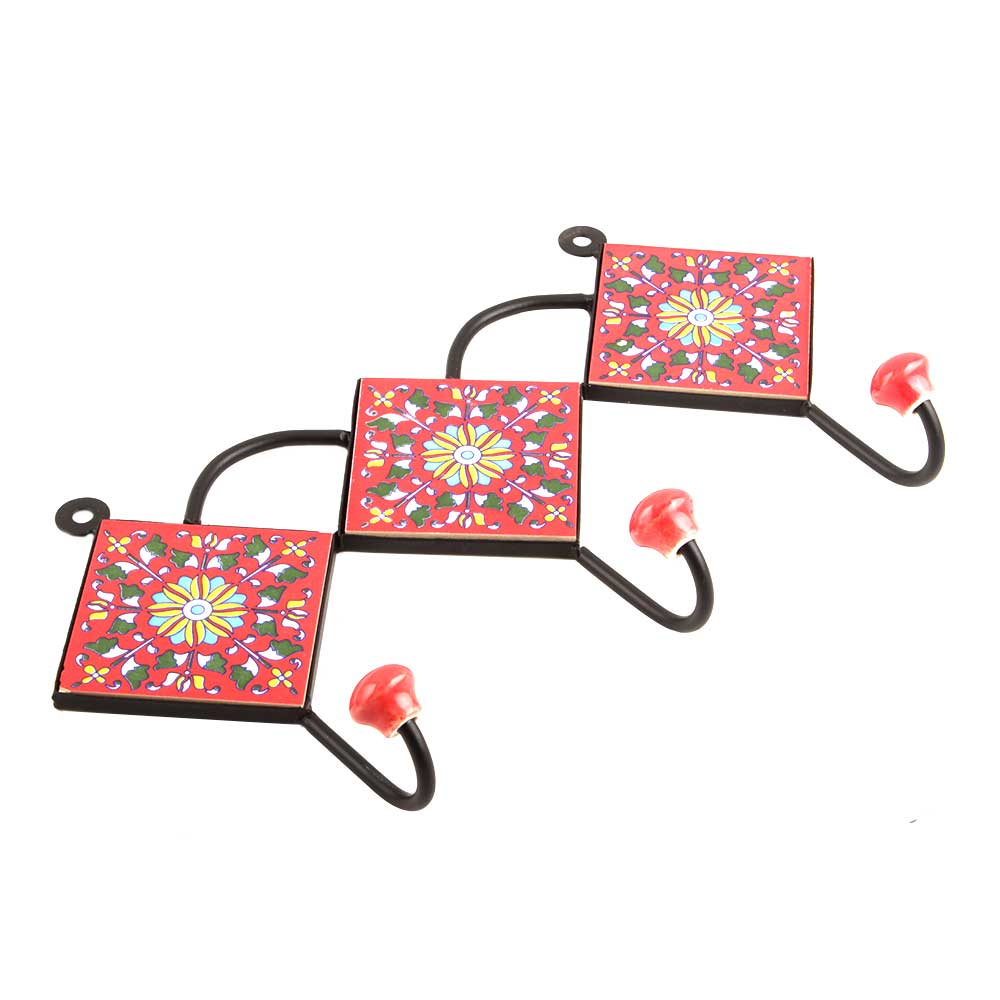 Red Yellow Flower Tiles Hook. When Put on Wall or Cabinet It is An Art in Itself. the Metal Part of This Hook is Black Powder Coated.