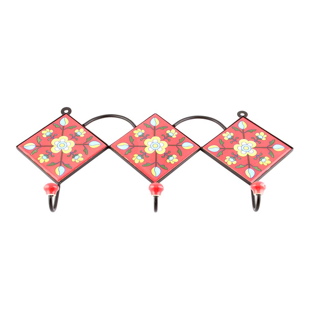 Red Yellow Tiny Flower Ceramic Tiles Hooks. When Put on Wall or Cabinet it is an Art in itself. The Metal Part of this Hook is Black Powder Coated.