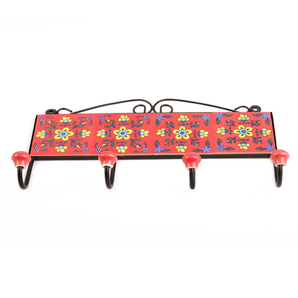 Red Yellow Tiny Flower Tiles Hooks .When put on wall or cabinet it is an art in itself. The metal part of this hook is black powder coated.