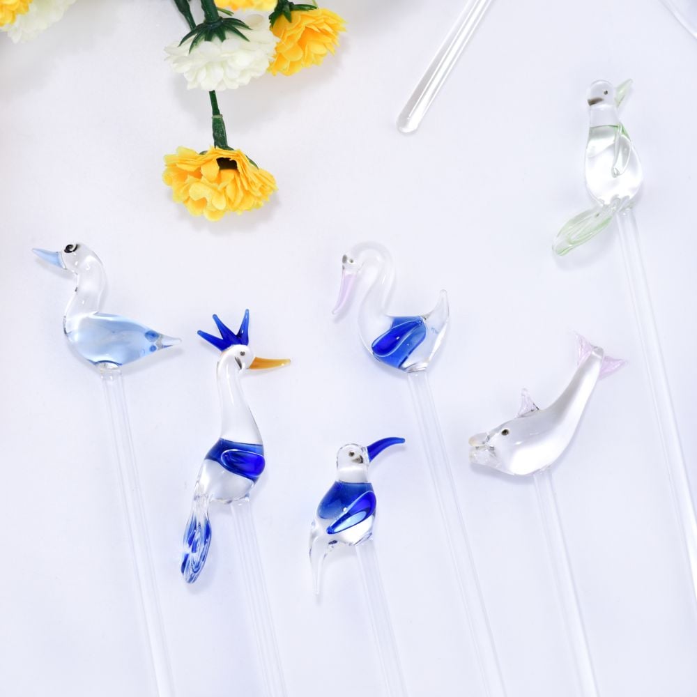 These delightful assorted glass stirrers or swizzle sticks are ideal for drink mixing and stirrers for iced tea and all of your favorite drinks! Your cocktail party guests will be delighted if you dress up your margaritas, daiquiris, and pina coladas. These make a fun and unique gift for any hostess or bartender. The intricate designs are stunning and will complement any type of drink. Hand-blown made of high quality glass and finished in clear cut style and beautifully crafted, this multi-color set with assorted shapes of figurine on top.