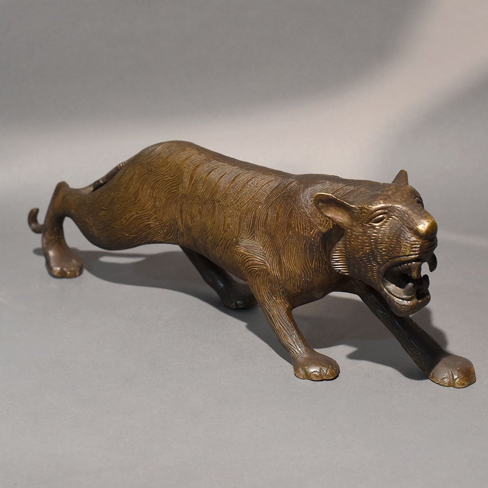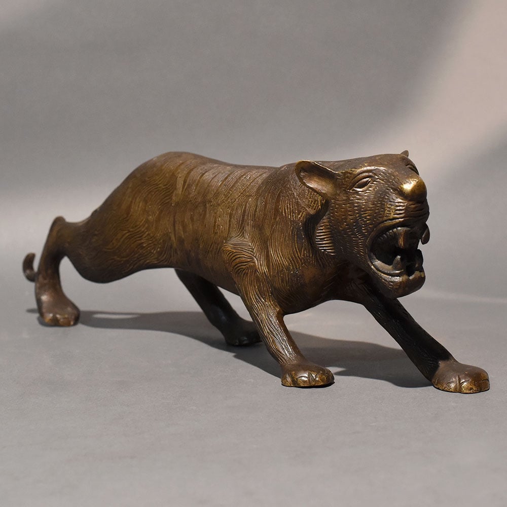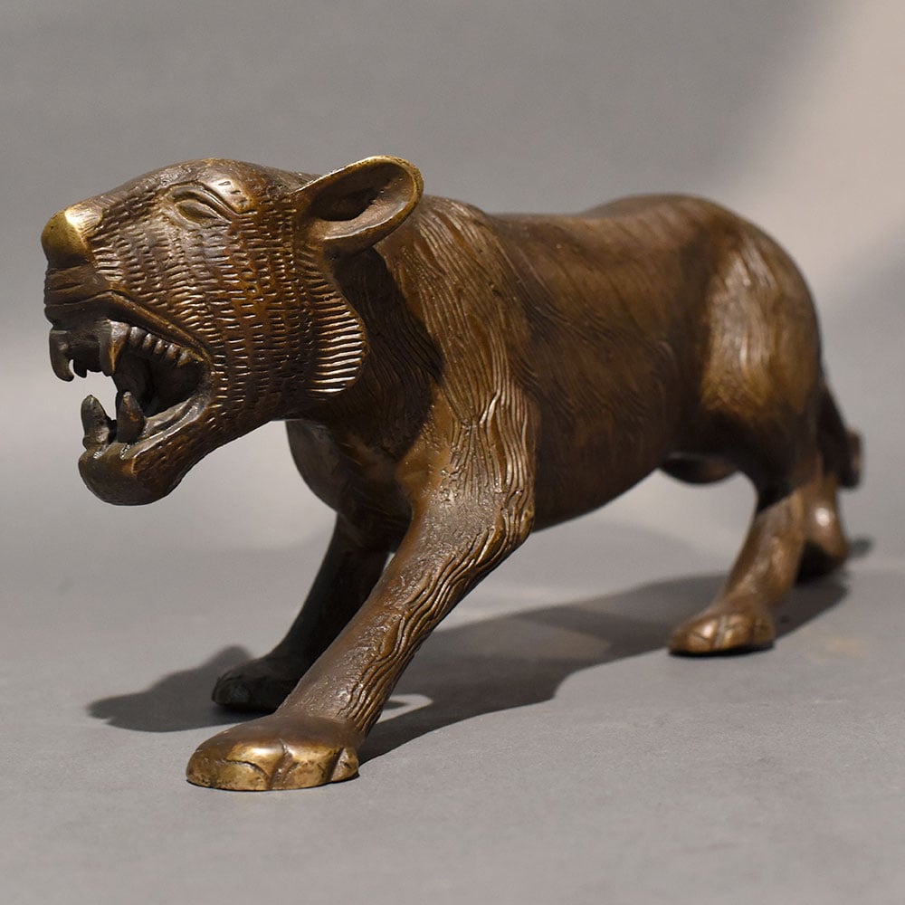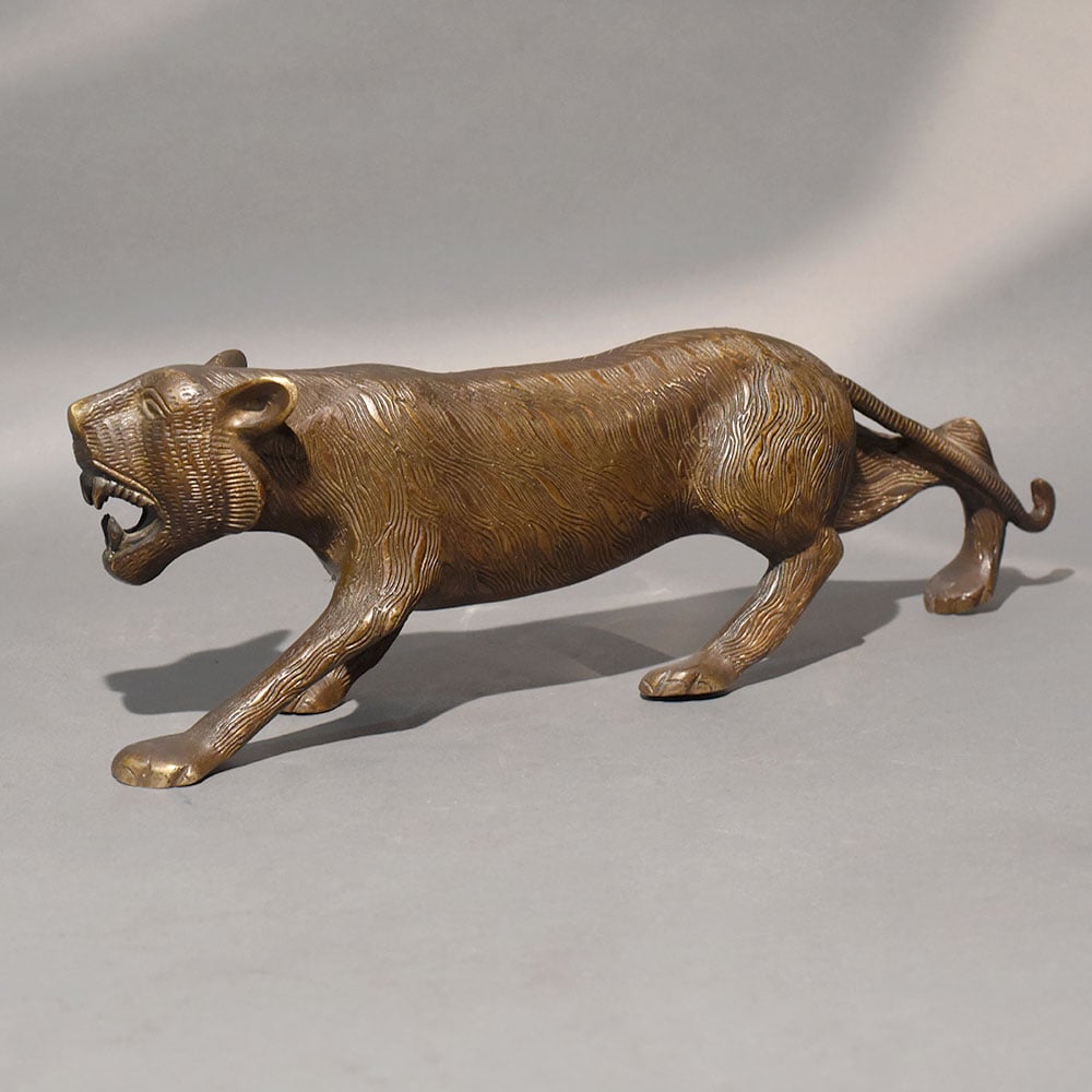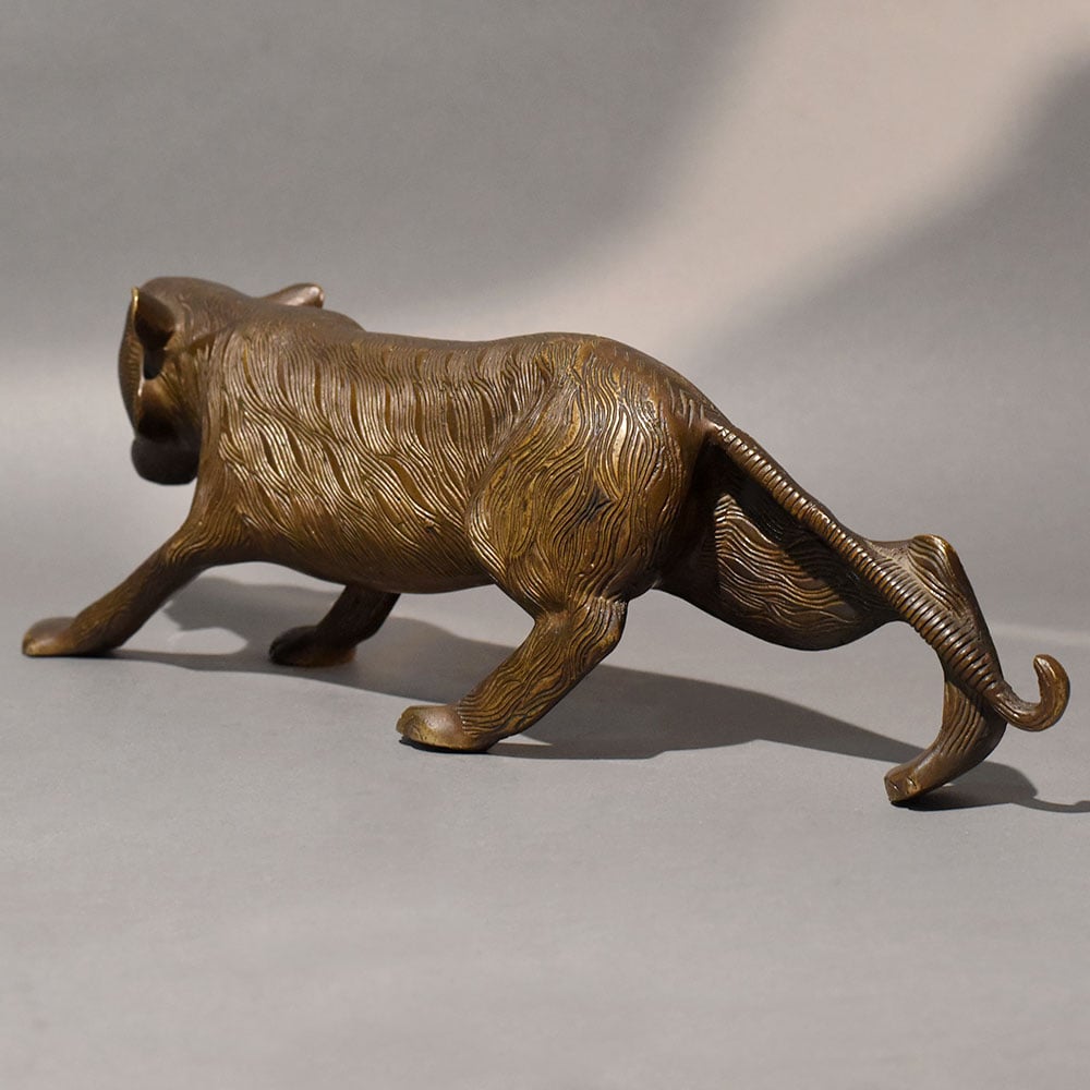 This roaring tiger sculpture handcrafted in solid brass captures raw power and dynamic movement in a striking decorative form. Sculpted mid-stride with an extended body and open jaws, the figure conveys fierce intensity and commanding presence. The forward-leaning posture and outstretched limbs create a sense of motion, making it a bold statement piece for curated interiors. The surface features finely engraved fur textures that run across the body, adding depth and realism to the design. The detailed facial expression, with defined teeth and sculpted whisker patterns, enhances its dramatic appeal. Finished in a rich antique bronze tone, the sculpture carries natural shading variations that accentuate its muscular contours and expressive form. Crafted using traditional metal casting techniques, this handcrafted brass tiger figurine offers durability along with artistic character. Tigers are widely recognized as symbols of strength, courage, and leadership. In decorative styling, they often represent authority and protection, making this sculpture suitable for offices, study rooms, living spaces, or themed Decor collections. Its elongated form allows it to stand prominently on console tables, shelves, or display cabinets. The solid brass construction ensures long-lasting structural integrity, while subtle finish variations reinforce its artisanal authenticity.