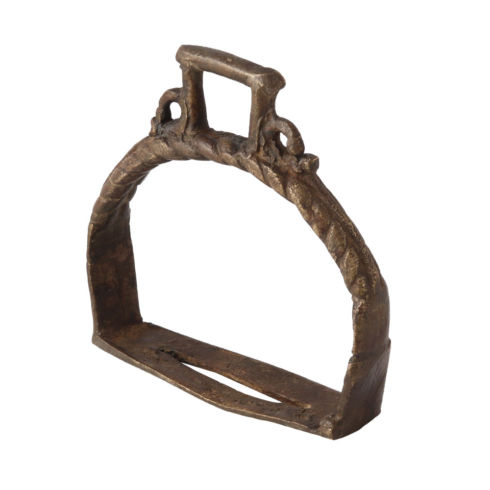 The semi-circular loop that the foot is placed in, as opposed to the leather strap that suspends it, displays an ancient brass rope pattern. original handcrafted horse paddle footrest made of brass. Superb piece for a collection, home decor, or present.