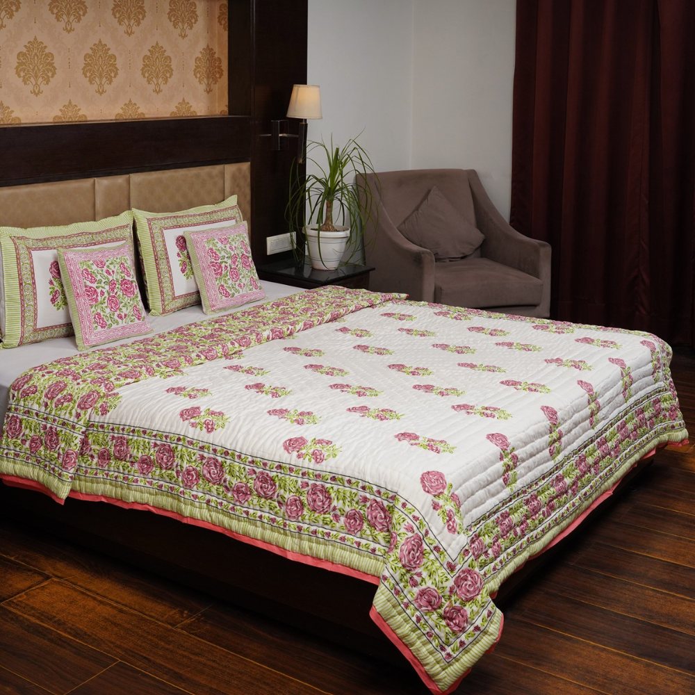 This white and pink Malmal (Voile) quilt embodies timeless elegance with its delicate hand-block floral prints and pastel green accents. Crafted from fine cotton voile, it offers breathable comfort and lightweight warmth, making it ideal for all seasons. Beautifully handmade and quality-checked by Indianshelf to ensure exceptional craftsmanship.