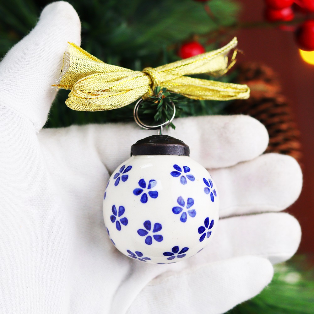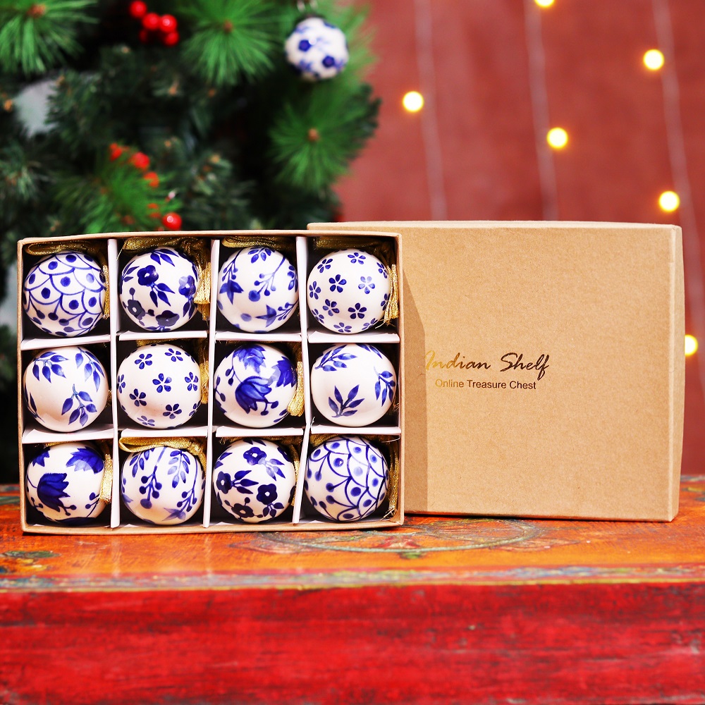 Indianshelf.com for bulk/wholesale orders.Indianshelf.us for personal purchases.The Round Blue and White Balls Ceramic Christmas Ornaments are the perfect way to add a touch of sophistication and timeless charm to your Christmas tree this season. Featuring a set of 12 beautifully crafted ceramic ornaments, these blue and white balls bring an elegant, classic look to any holiday decor. Their delicate design and vibrant color combination will surely captivate and bring a festive spirit to your home.