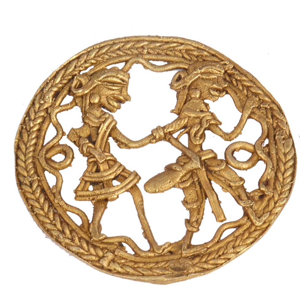 Round Brass Dhokra Art Tribal Folk Dancers in a round frame where the man is playing the trumpet and his lady is dancing in a particular style. Diwali gift, Christmas gift, house warming gift, souvenir and for home, office.