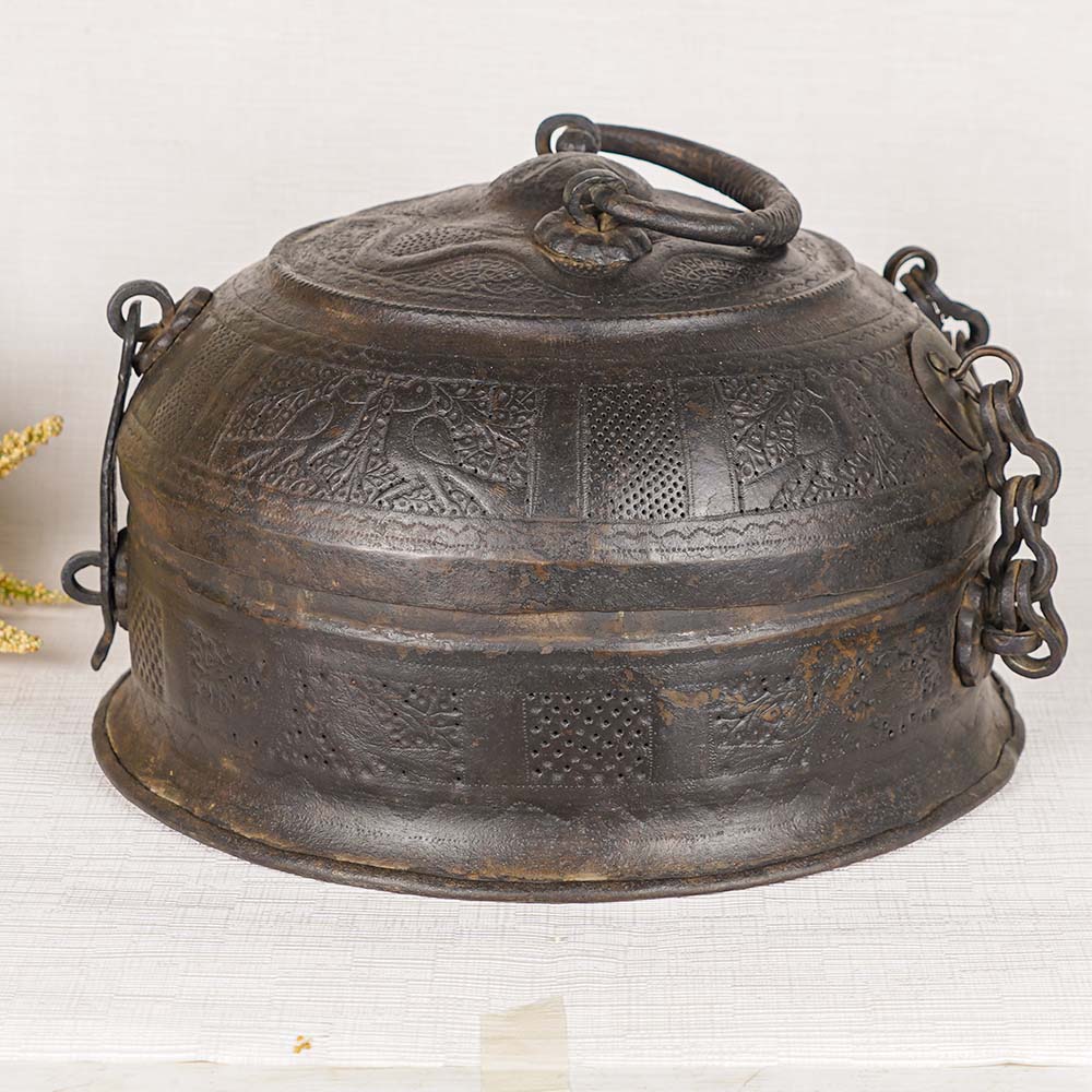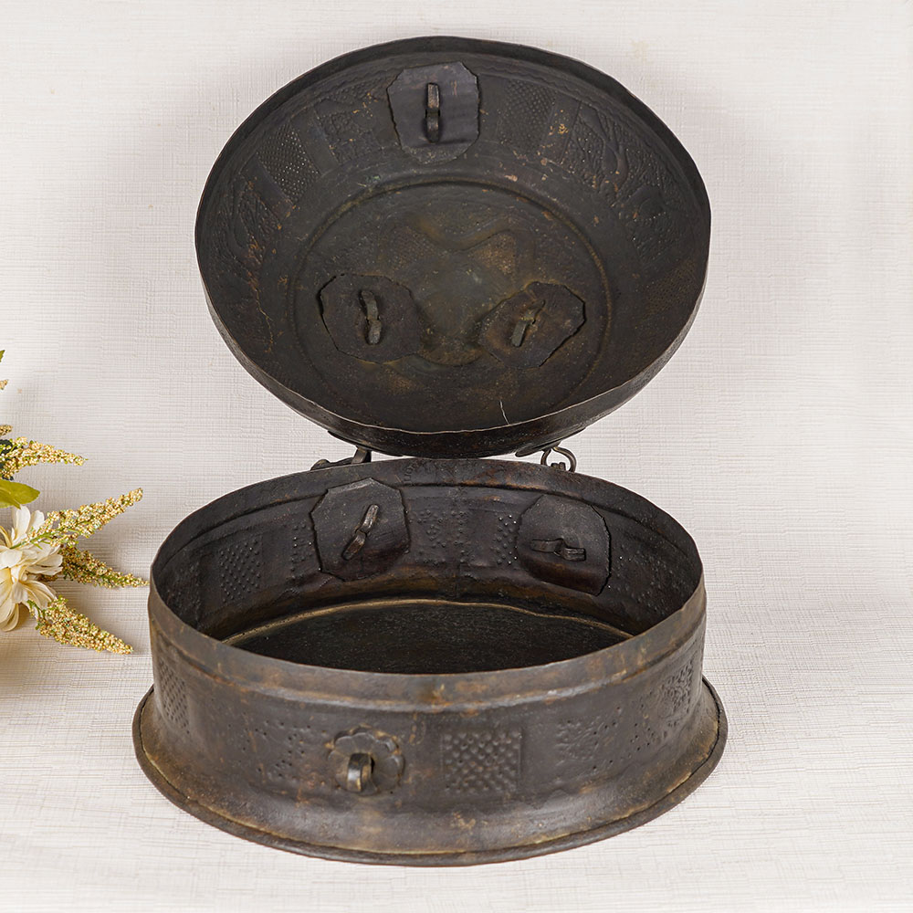 A Stunning Brass Vintage Jewelry Box that is a true embodiment of elegance and tradition. Crafted in a captivating round shape and finished in a sleek black hue, this box exudes sophistication and timeless beauty. The box features a secure latch to keep your treasures safe and a convenient handle on top, allowing for easy portability. With its rich heritage, this jewelry box carries the legacy of Indian households, where it was once used to store precious jewelry. Meticulously handcrafted by skilled Indian artisans, it showcases their expertise and attention to detail. The box serves a multitude of purposes, whether it's safeguarding your cherished jewelry and small items or serving as a captivating display piece at exhibitions, museums, shops, hotels, or restaurants. Furthermore, this brass vintage jewelry box makes an incredible gift for your loved ones on special or festive occasions. It caters to the needs of girls and women alike, making it an ideal choice for a girl’s jewelry box or women's jewelry box. Elevate your style and preserve your treasured possessions with the best jewelry box that combines functionality, aesthetics, and cultural significance.