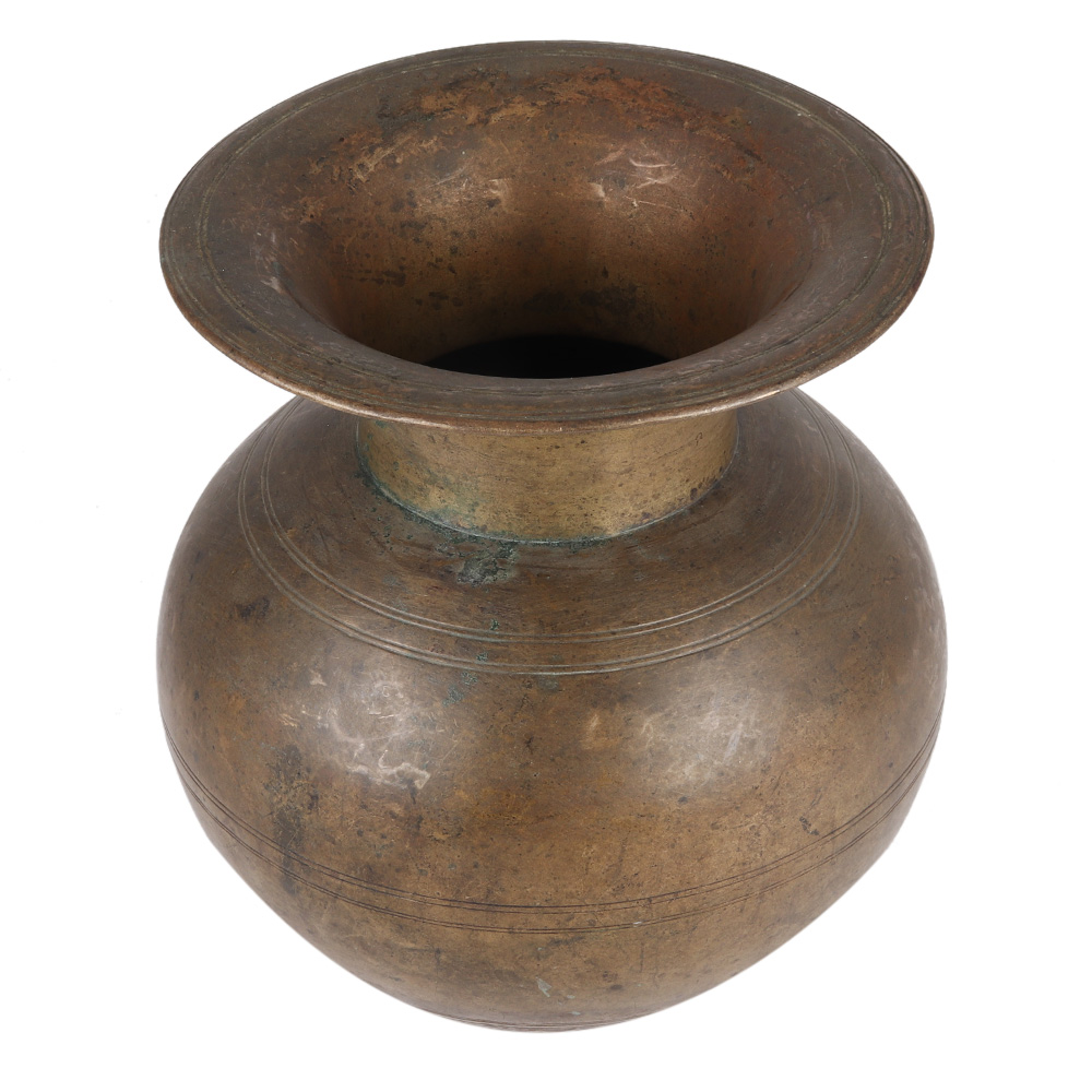 A traditional water pot in a round base and a long neck with flat rim. It can be used as a decorative piece for your kitchen shelf , as a flower pot or as a gift for your friends an relatives. It has a dark patina finish which makes it look very appealing.