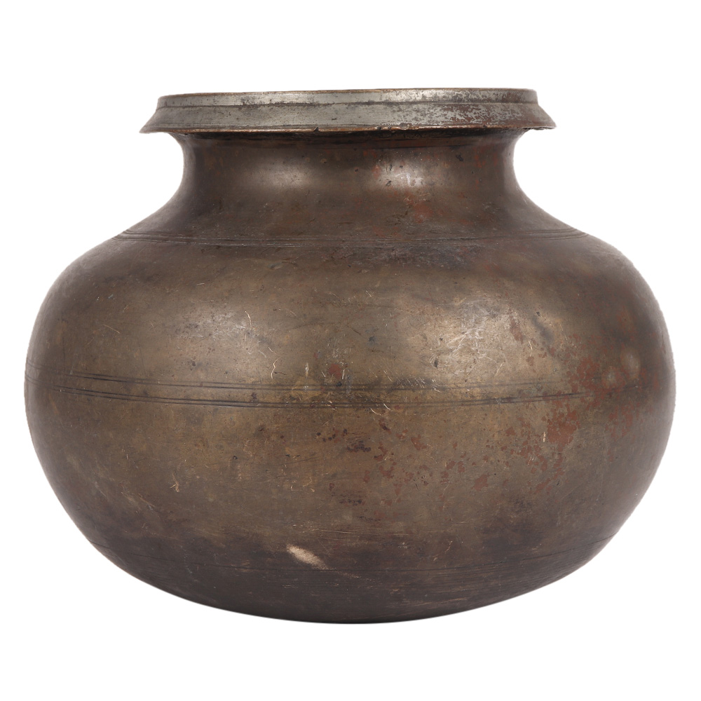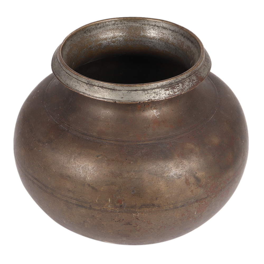 This strong Lota water pot is a rare piece that is quite heavy, robust, durable and heavy weighted. The form is quite appealing. This water pot is in excellent shape. In India, brass Lotas were used to store and serve water. The traditional Indian practice of storing water in brass vessels was believed to promote healthy living, and Indians drank their water from brass pots, which used brass as a medium for storing and drinking water. It can be used as a vase as well as a planter.