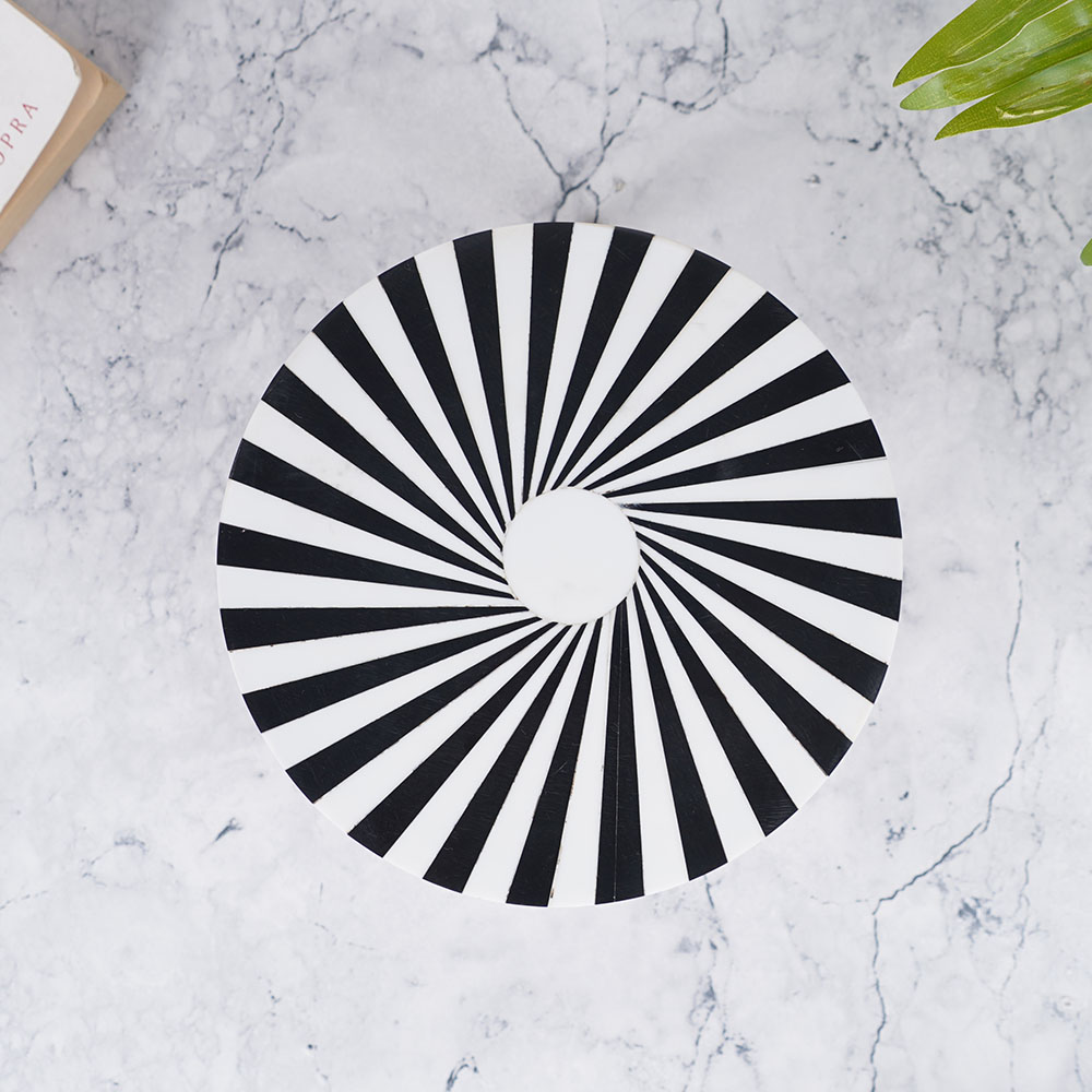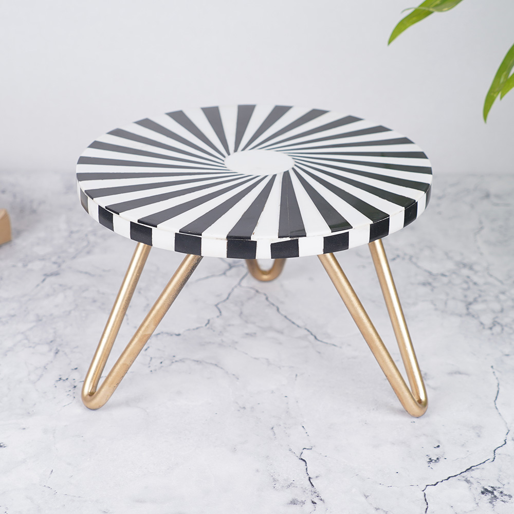 Introducing the exquisite wooden cake stand that is beautifully crafted by professional Indian artisans who specialize in wood and resin work. The stand boasts an elegant black and white pattern that catches the eye and elevates any cake placed upon it. The round cake stand is perfect for holding cakes, cupcakes, or any other delectable dessert. The wood and resin cake stand is not just a functional item, but also a piece of art that adds charm to any table setting. The black and white colour scheme creates a timeless, modern aesthetic that complements any occasion, from a simple family gathering to a grand event at a hotel or restaurant. Additionally, it comes with a black and golden iron stand option, giving you the freedom to choose the best match for your decor. This wooden cake stand is not just perfect for personal use, but also makes for a thoughtful and elegant gift for your loved ones. So whether you're celebrating a birthday, anniversary, or any other special occasion, this white and black cake stand is sure to impress!