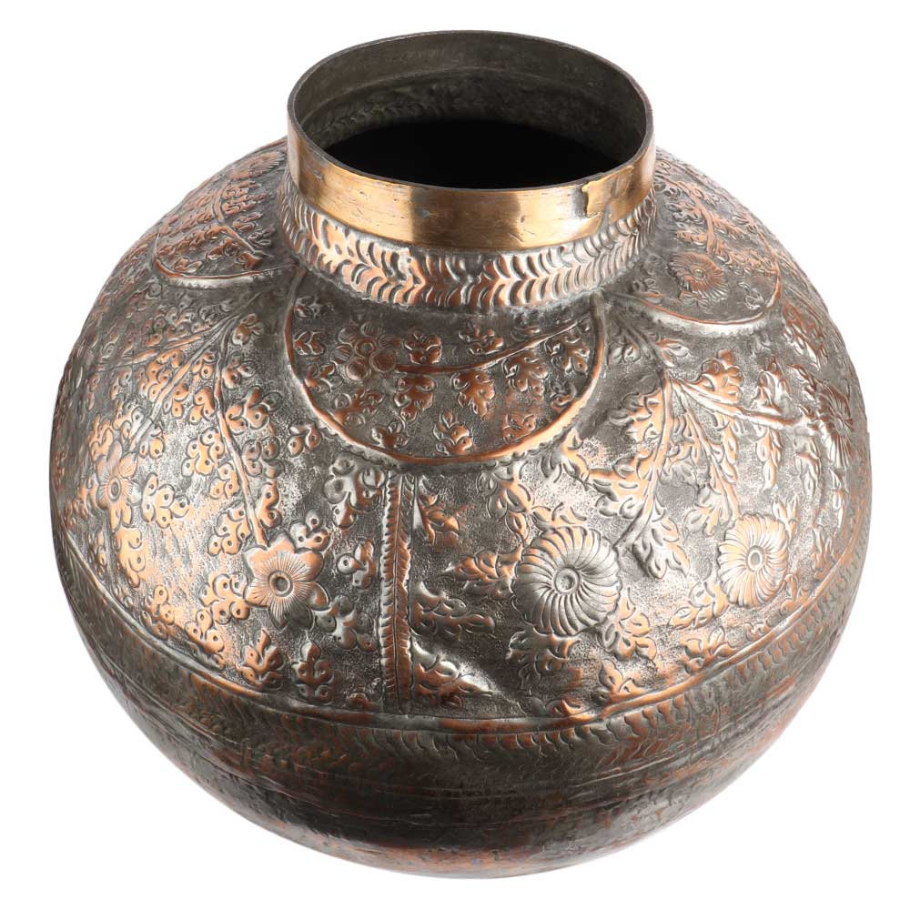 Very spacious round copper pot made in traditional way made by the local artisans of India. It has embossed design just below the neck and rim. Kitchen ware, interior and outdoor decoration, flower decoration, planter pot , garden decoration, Diwali decoration, wedding and anniversary gift.