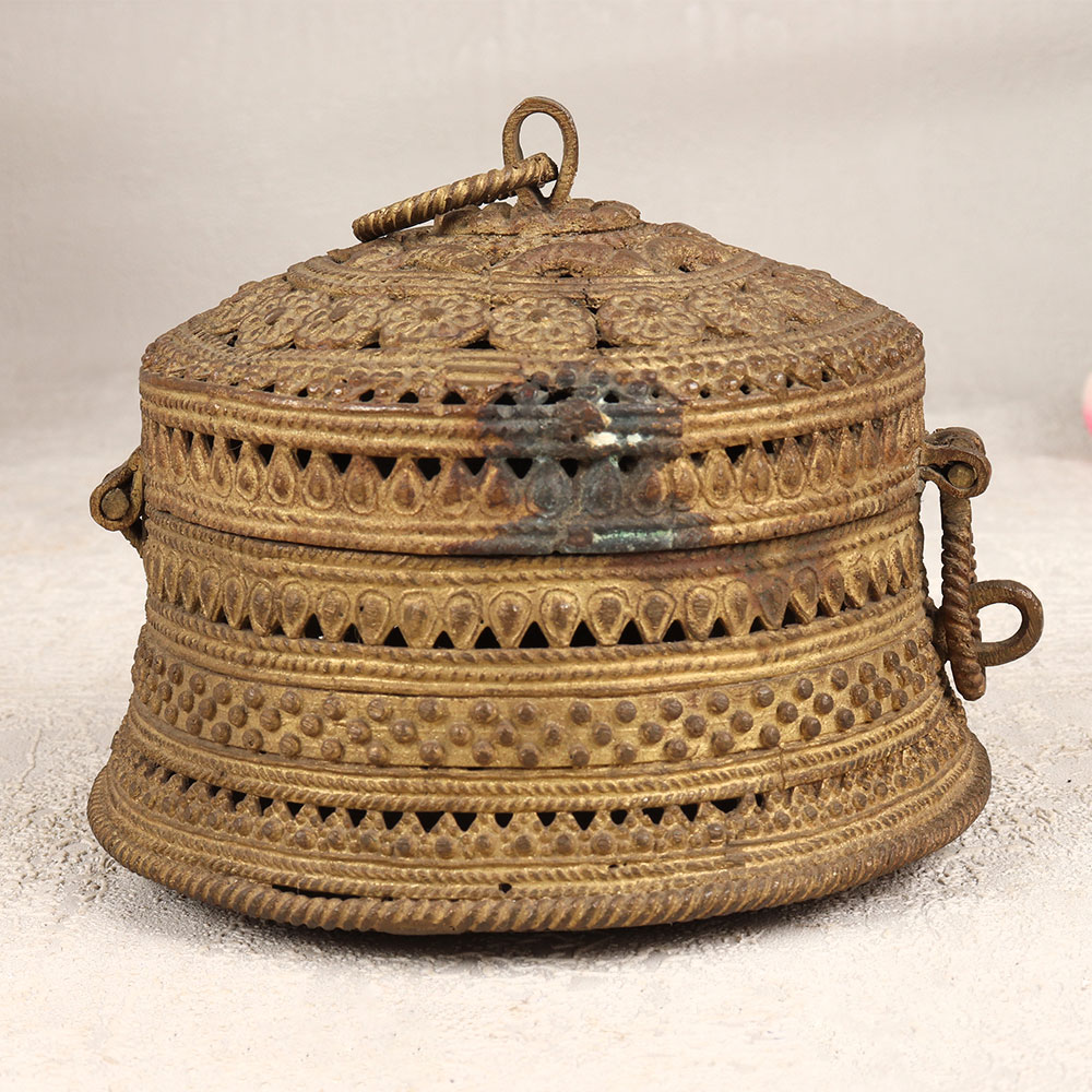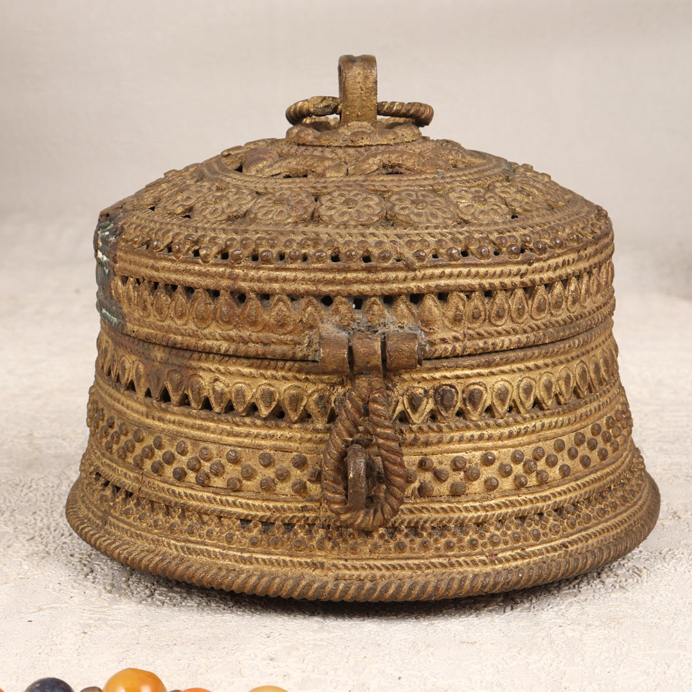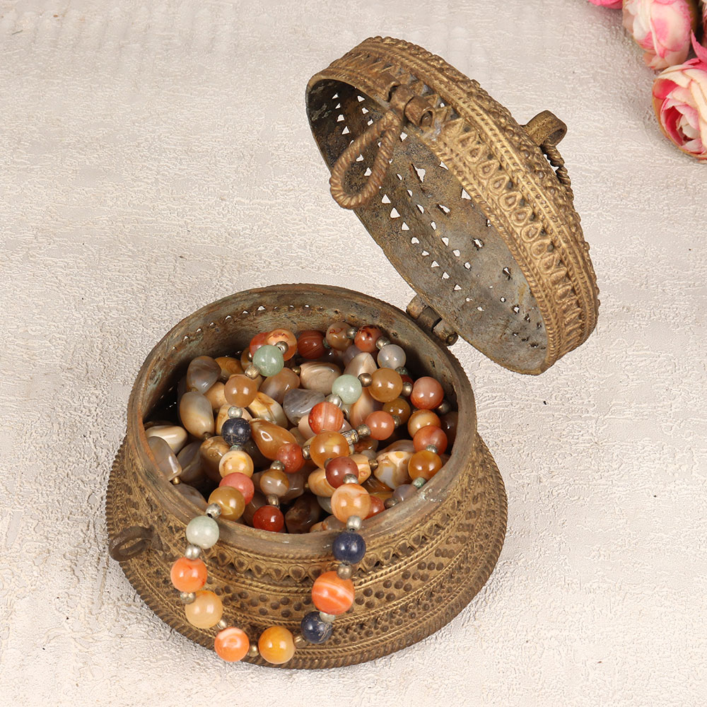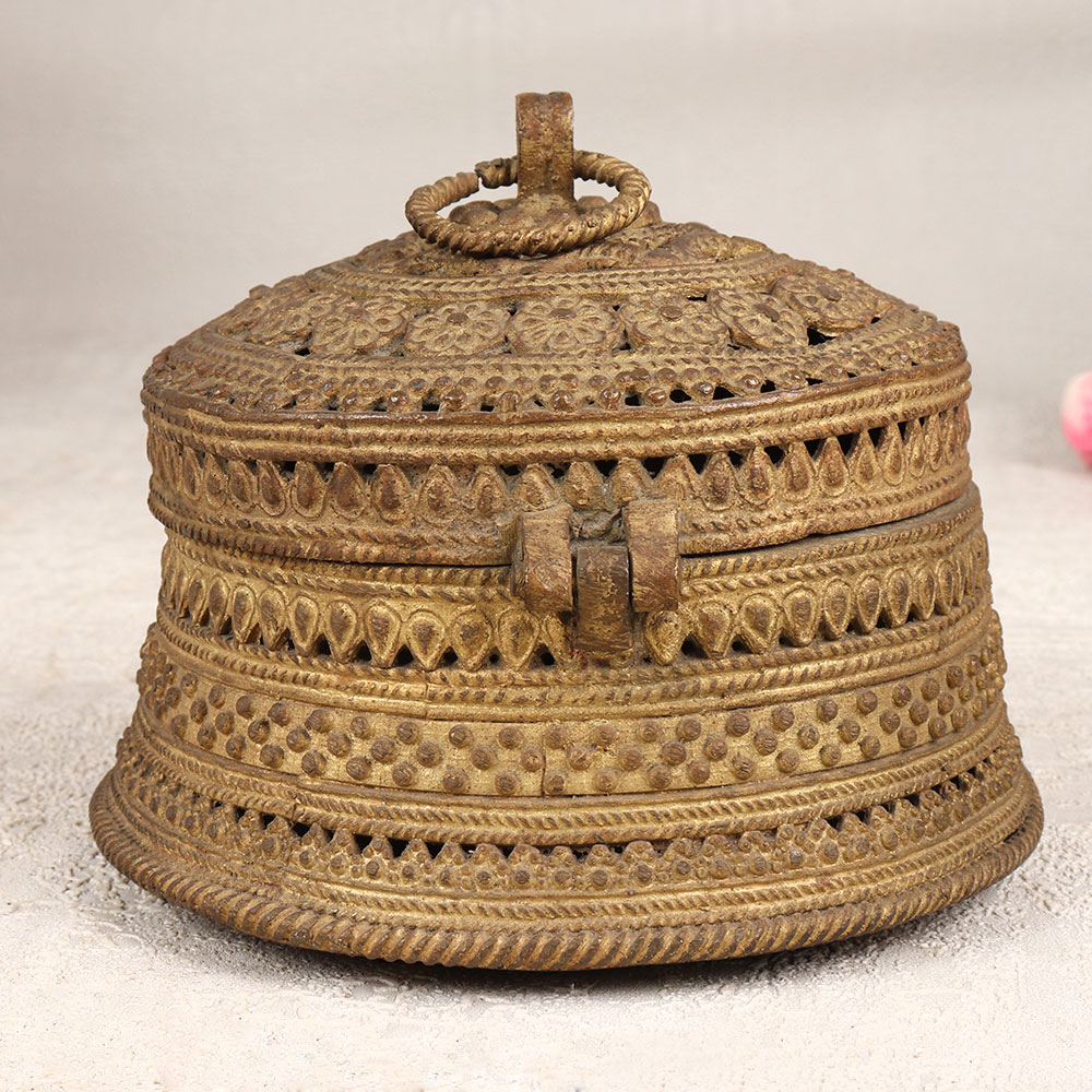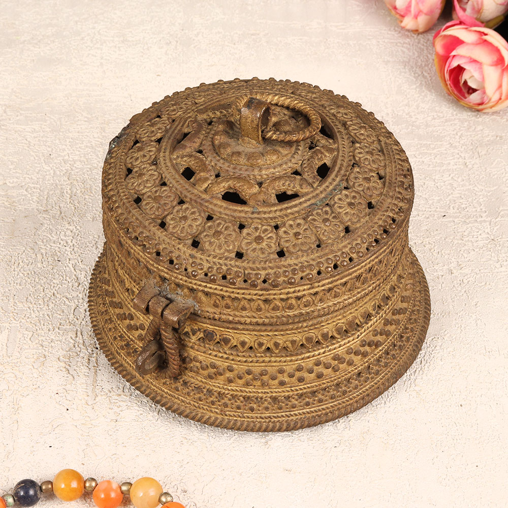 This Vintage Brass Jewelry Box is a timeless piece crafted with precision and passion by talented Indian artisans in the traditional Odisha Art style. This round-shaped box is a testament to the artistry of its creators, adorned with intricate engravings that tell a story of heritage and craftsmanship. The latch ensures the security of your cherished jewelry and precious stones, making it a functional and elegant storage solution. With its antique brown finish, this jewelry box exudes a classic charm that effortlessly complements any space. Handmade from high-quality brass, it showcases the enduring beauty of artisanal workmanship. Ideal for adorning homes, offices, restaurants, hotels, or cafes, this piece seamlessly merges utility with aesthetics. Moreover, it makes for a thoughtful and meaningful gift for your loved ones on special, festive, or auspicious occasions, encapsulating the spirit of tradition and craftsmanship.