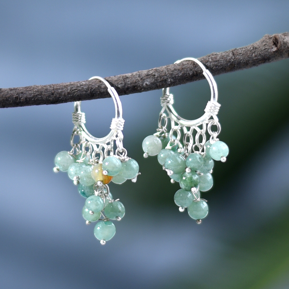 Round Green Onyx Beaded Hoop Earrings in 92.5 Sterling Silver