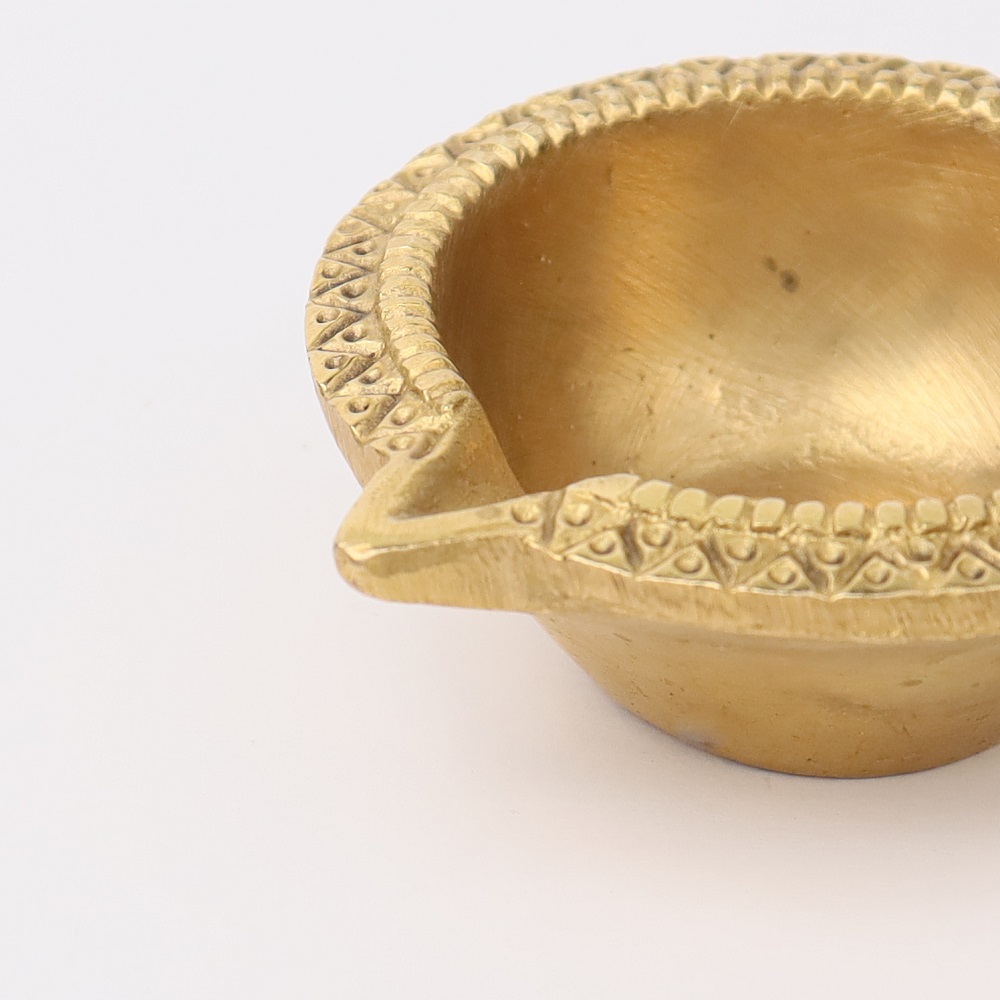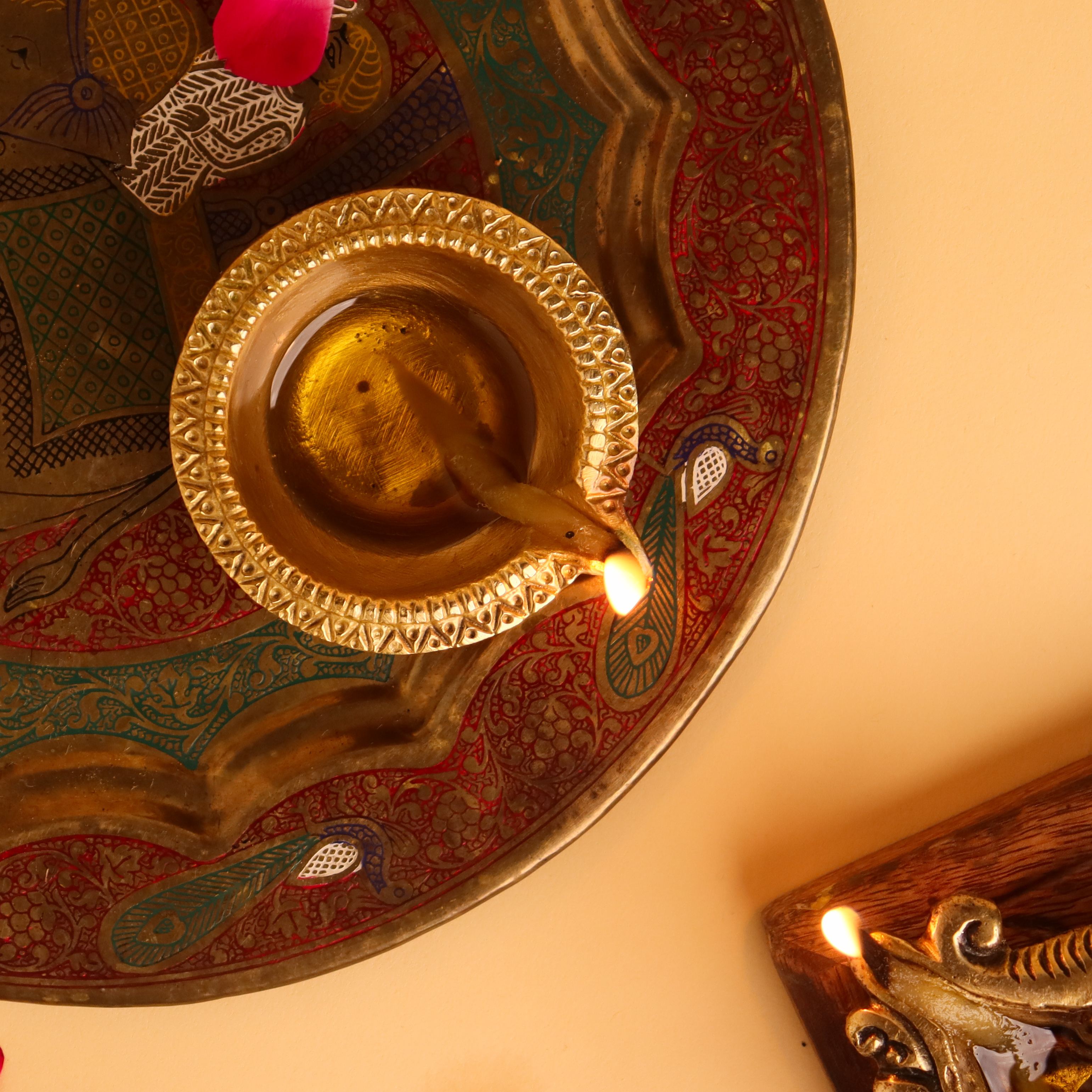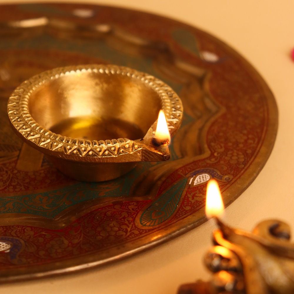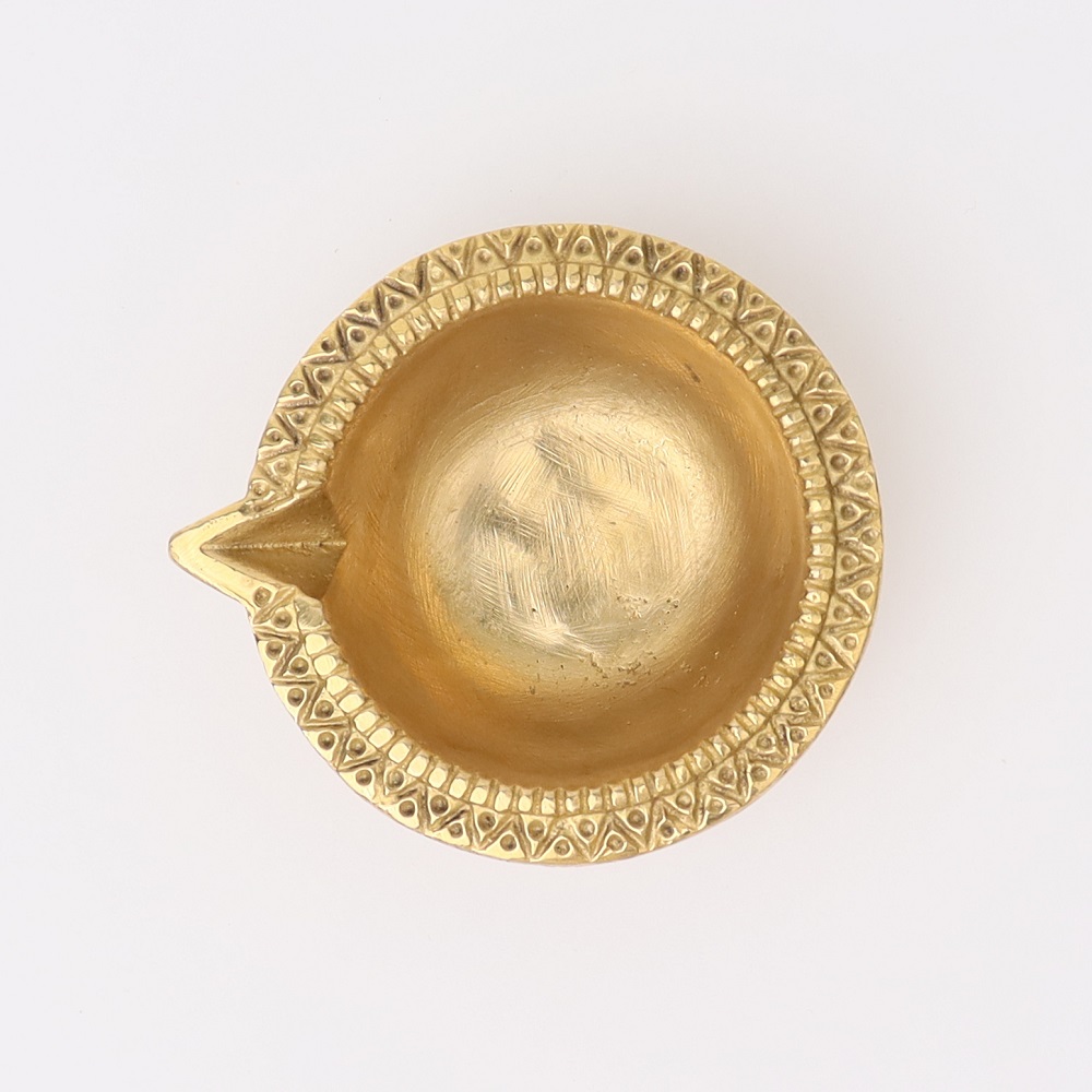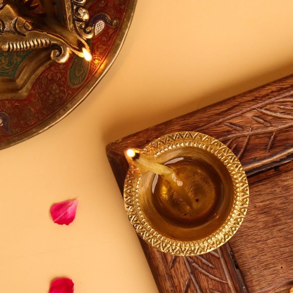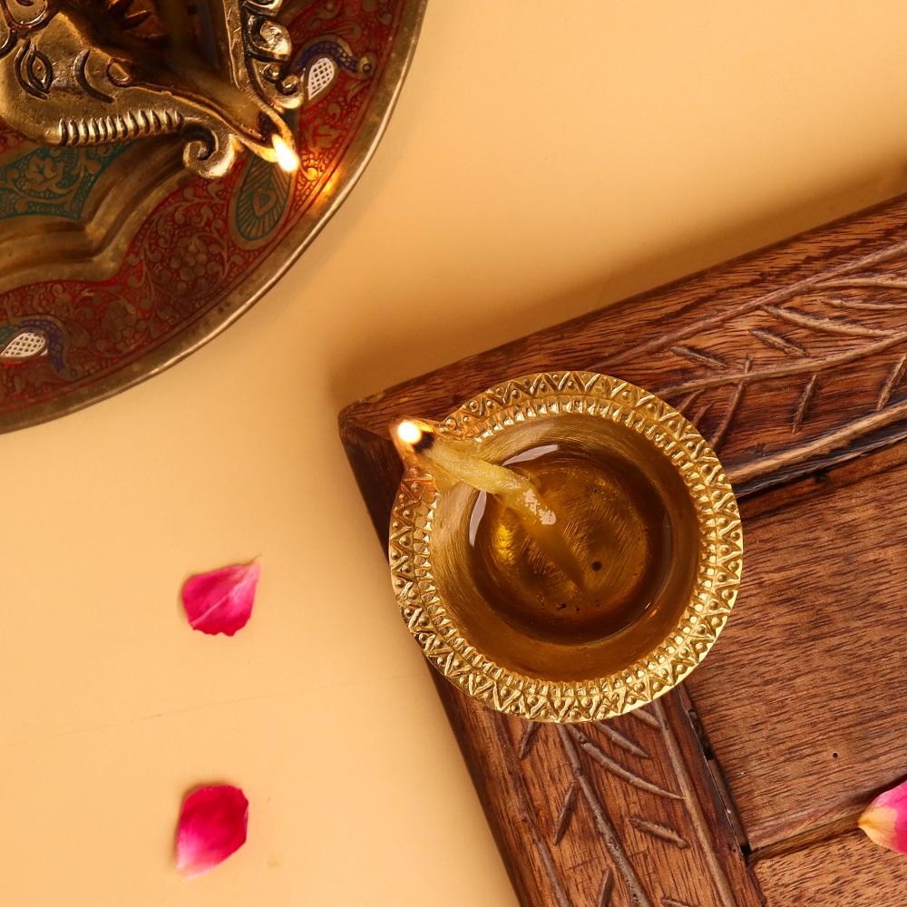 Illuminate your sacred spaces with this round, handmade, golden brass diya, a timeless piece of Indian craftsmanship. Hand-cast in pure brass, the diya glows with a warm golden sheen, symbolizing prosperity and positive energy during Diwali and daily rituals. Its compact size and elegant round shape make it perfect for temple décor, altar offerings, or festive lighting. Designed with both function and beauty in mind, this diya reflects centuries of artisan skill and devotion.