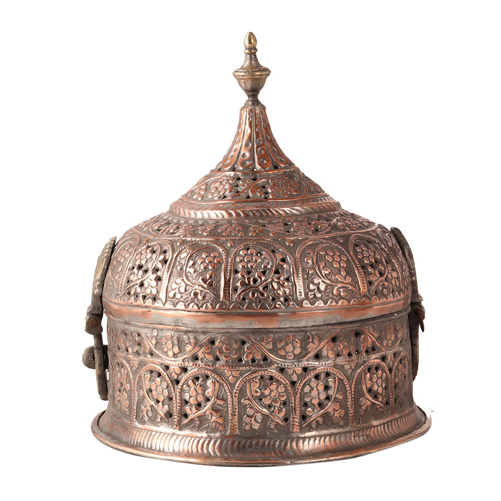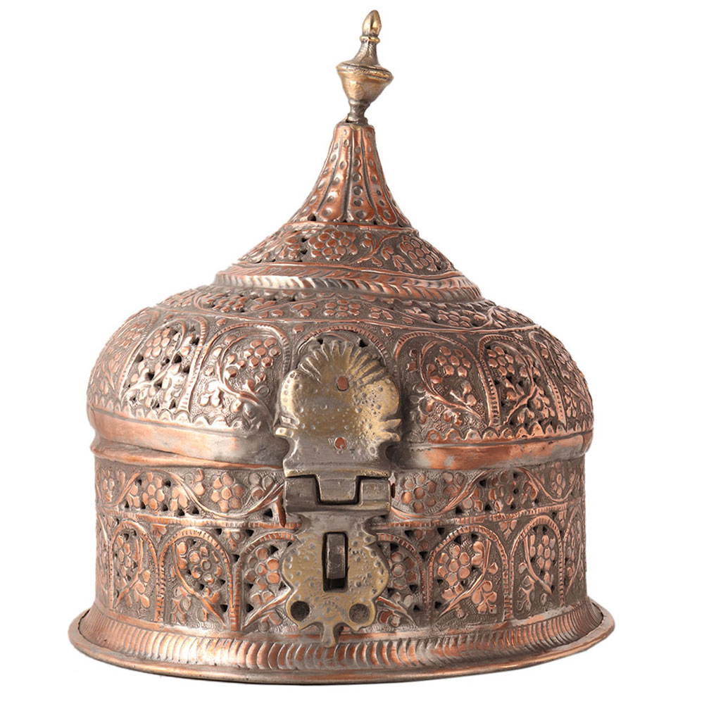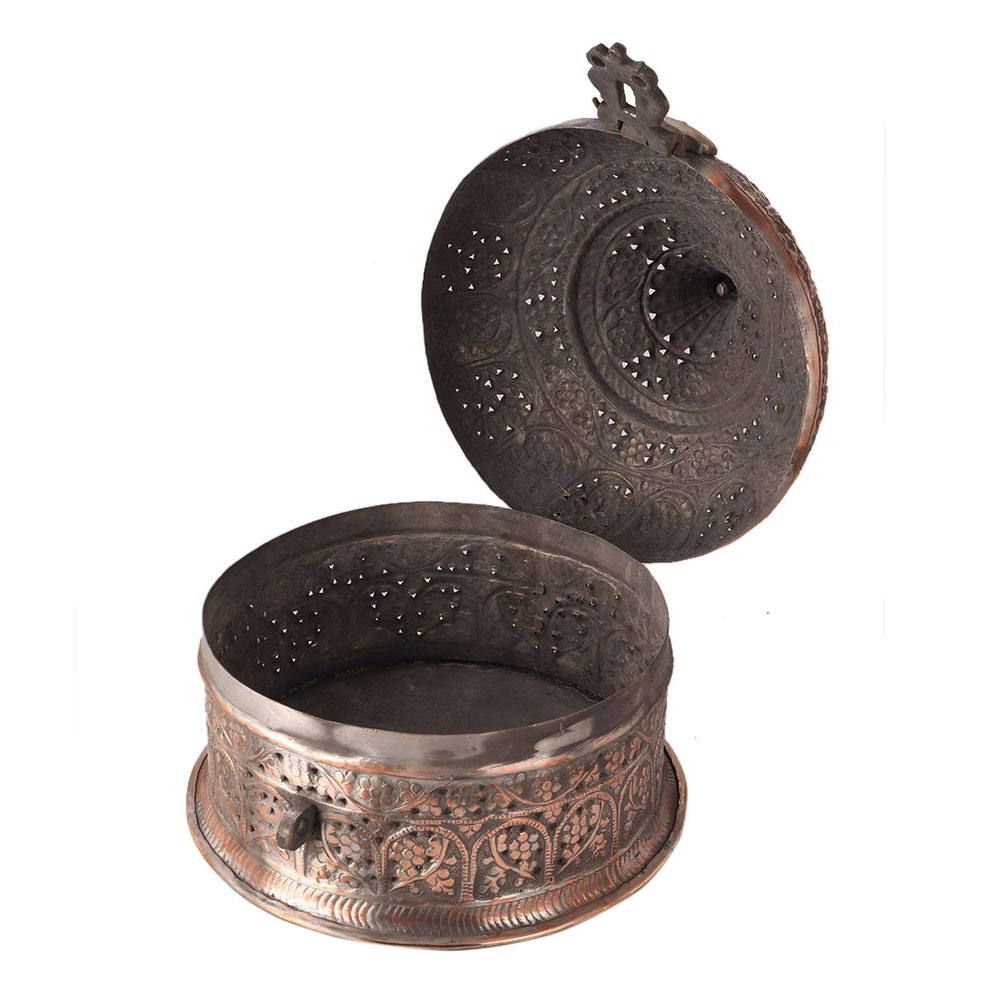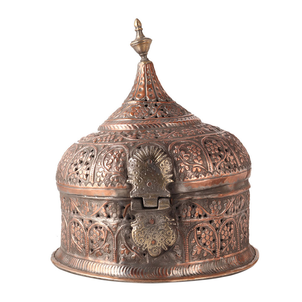 This handmade box is used to store jewelry. It has a lid on it's top and is made of copper. Beautiful engraved floral motifs describe Islamic art. It can be used for decoration or to store your jewelry and other items.