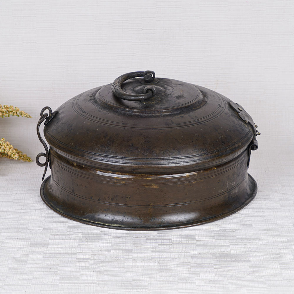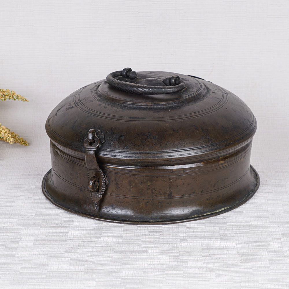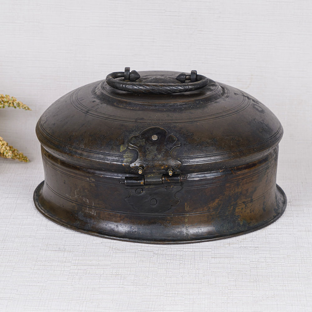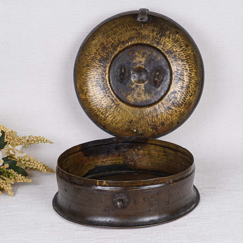 A round jewelry box, meticulously handcrafted by highly skilled Indian artisans, employing time-honoured traditional techniques. This remarkable piece boasts a stunning black finish, lending it an alluring vintage charm. Designed with functionality in mind, it features a convenient handle atop for effortless portability and a secure latch for locking precious treasures within. Originally conceived as a storage solution for jewelry in homes, this versatile box now serves as an ideal sanctuary for storing various precious items in any contemporary setting. Beyond its practicality, this remarkable brass jewelry box doubles as a captivating decorative piece. Whether gracing the ambiance of your home, office, restaurant, or hotel, its presence exudes an air of elegance and refinement. It serves as an exquisite centerpiece at exhibitions or museums, captivating and enchanting all who behold it. Additionally, it makes for a thoughtful and cherished gift for loved ones during special or festive occasions. Uniting timeless craftsmanship and unparalleled beauty, this brass round jewelry box stands as a testament to the rich heritage of Indian artistry.
